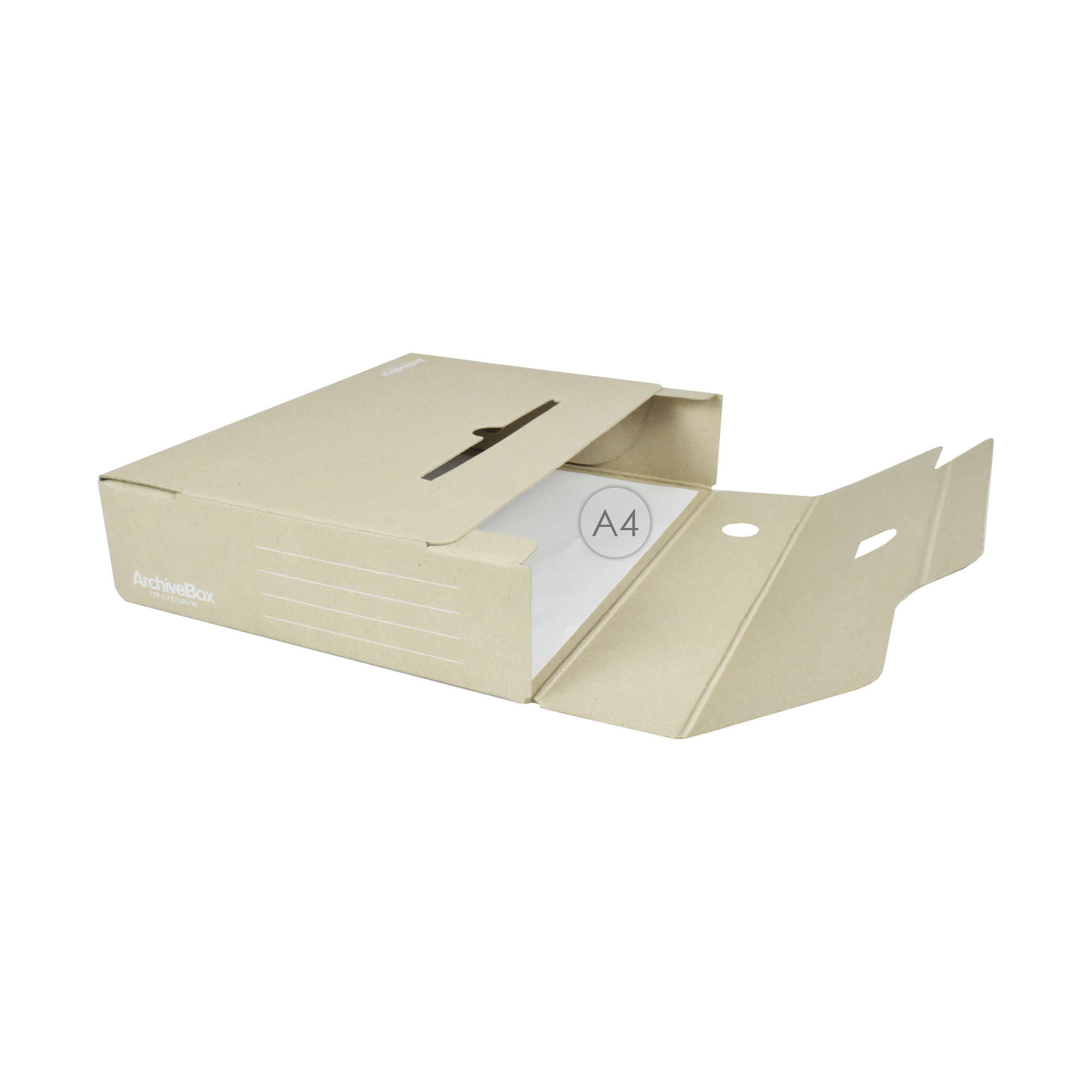 Systém archívnych boxov a škatúľ z vlnitej lepenky. Dodávané v rozloženom stave. Farba prírodná hnedá. Archívny box z hladkej ručnej lepenky, 1 000 g/ m². Konštrukčné riešenie boxu umožňuje rýchly prístup k vloženým dokumentom. Rozmery