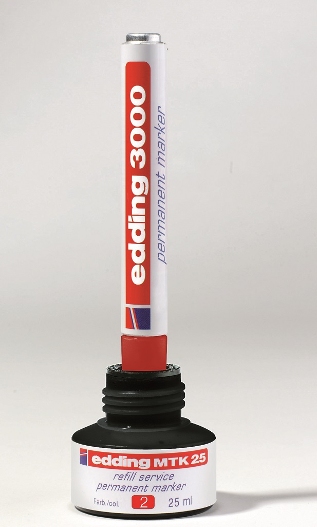 Atrament slabého zápachu s kapilárnym systémom na dopĺňanie permanentných popisovačov edding 2000/-2000 C, 2200/-2200 C, 400, 300, 330 a 370. Obsah 25 ml. Tento chemický prípravok je nebezpečný. Pri dopĺňaní vložte prednú časť popisovača špičkou do fľaštičky a po niekoľkých minútach bude popisovač pripravený k opätovnému použitiu. Obsah 25 ml.