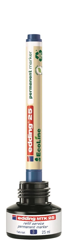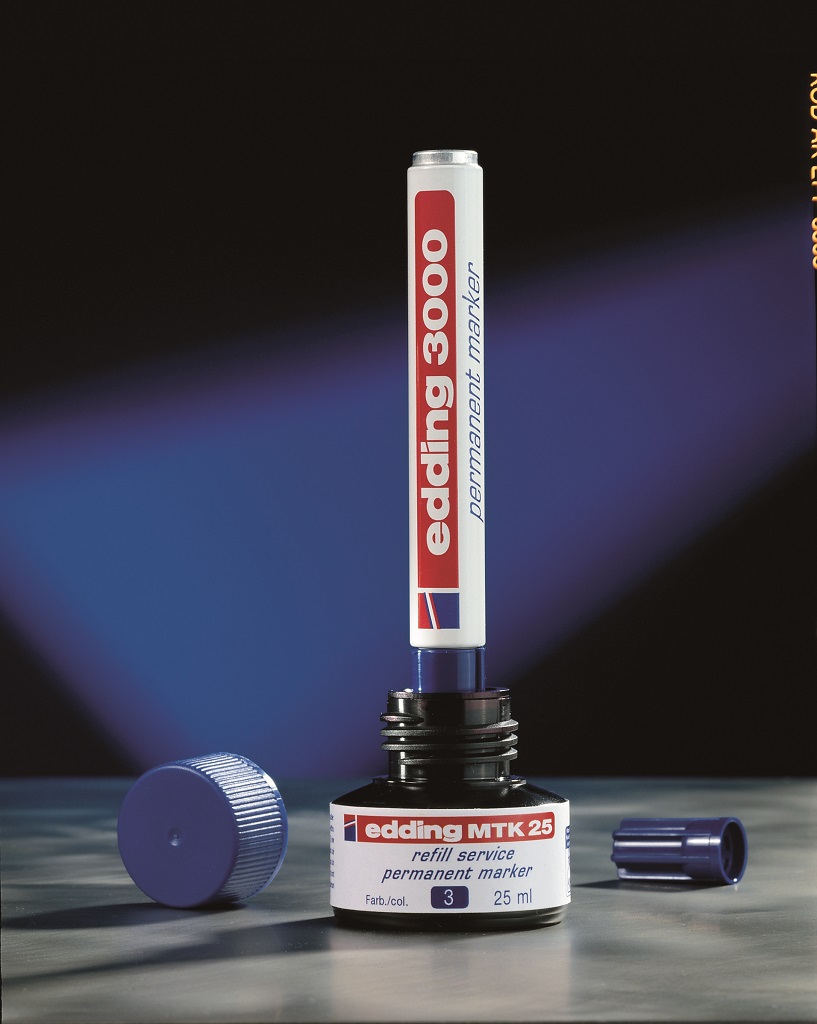 Atrament slabého zápachu s kapilárnym systémom na dopĺňanie permanentných popisovačov edding 2000/-2000 C, 2200/-2200 C, 400, 300, 330 a 370. Obsah 25 ml. Tento chemický prípravok je nebezpečný. Pri dopĺňaní vložte prednú časť popisovača špičkou do fľaštičky a po niekoľkých minútach bude popisovač pripravený k opätovnému použitiu. Obsah 25 ml.