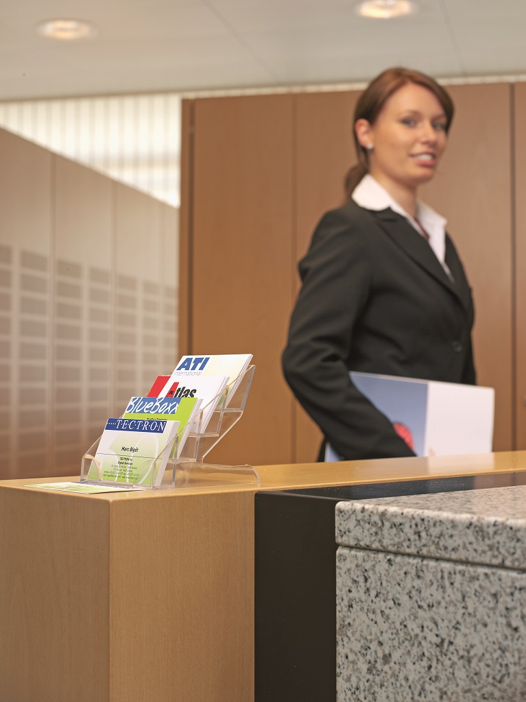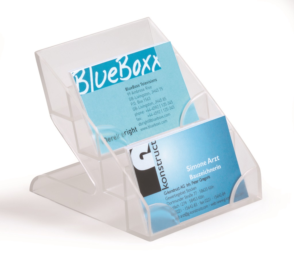 Priehľadný box z plastu so 4 rovnocennými priehradkami na skladovanie vizitiek. Kapacita 240 vizitiek. Možnosť spájania viacerých boxov pomocou spájacieho prvku. Farba číra.