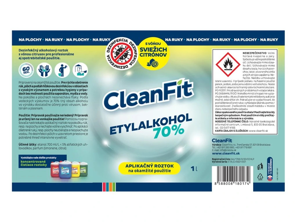 CleanFit dezinfekčný roztok Etylakohol 70% citrus 1 l + rozprašovač ZDARMA