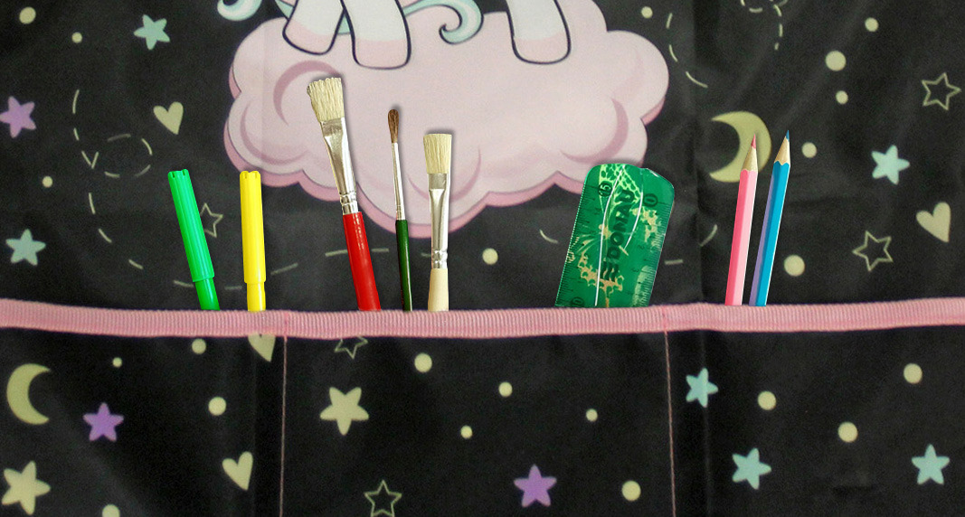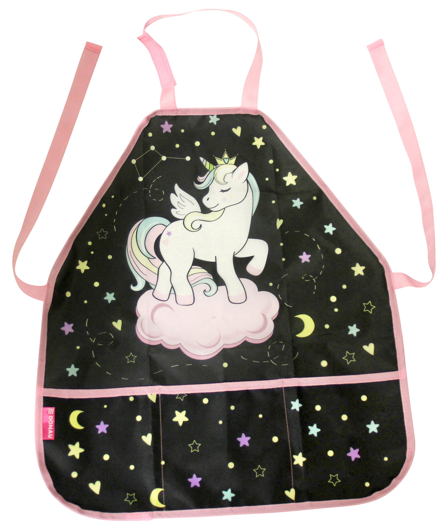 Detská maliarska/remeselnícka zástera v 2 rôznych vzoroch, s veľkým predným vreckom, s 3 vreckami na maliarske a remeselné potreby. Zapínanie na suchý zips pri krku a šnúrky vzadu, vrátane menovky. Materiál: polyester, univerzálna veľkosť: 54 x 46 cm. Motív pre dievčatá.