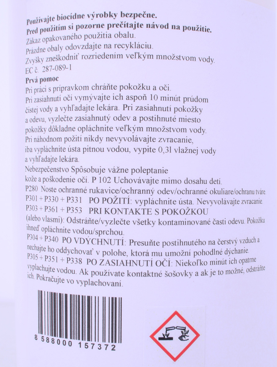 Používajte biocídne výrobky bezpečne. Pred použitím si pozorne prečítajte návod na použitie. Zákaz opakovaného použitie obalu. Prázdne obaly odovzdajte na recykláciu. Zvyšky zneškodniť roztriedením veľkým množstvom vody. EC č. 287-089-1.