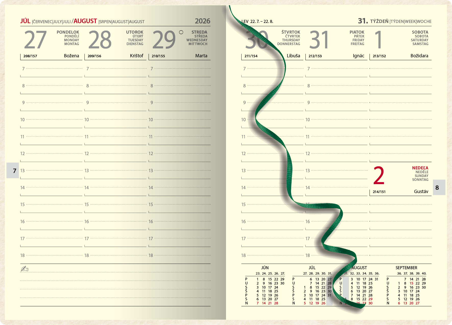 Certifikovaný týždenný diár s prehľadným slovenským kalendáriom na každý týždeň. Na obal je použitý vysokokvalitný papier NAPURA s prírodným dizajnom, 100 % recyklovateľný, s lacetkou. Vďaka vysokej kvalite vlákien je možná: termorazba, razba fóliou alebo ÚV tlač.