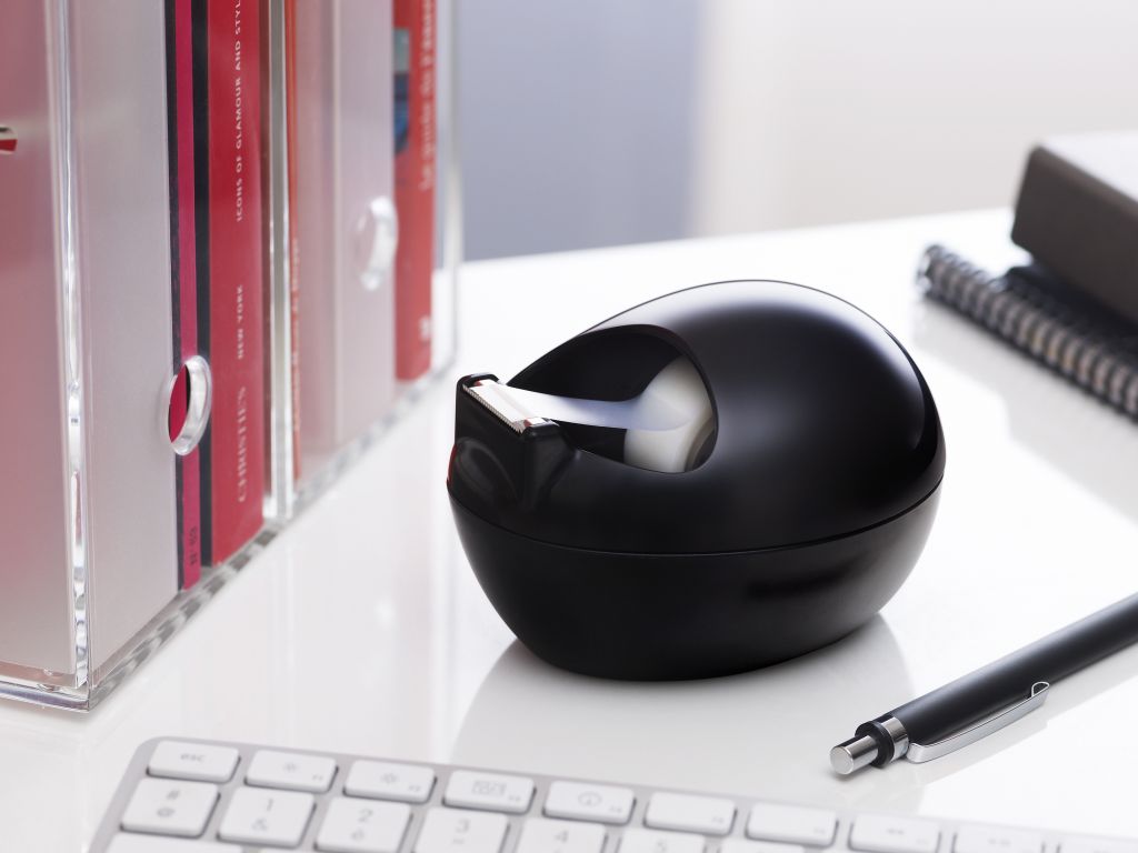Stolový dispenzor v modernom dizajne od Karima Rashida s vysoko kvalitným nožom na odrezanie pásky a neviditeľnou páskou z prírodných vlákien Scotch® Magic™ 900 rozmerov 19 mm × 33 m. Farba čierna.