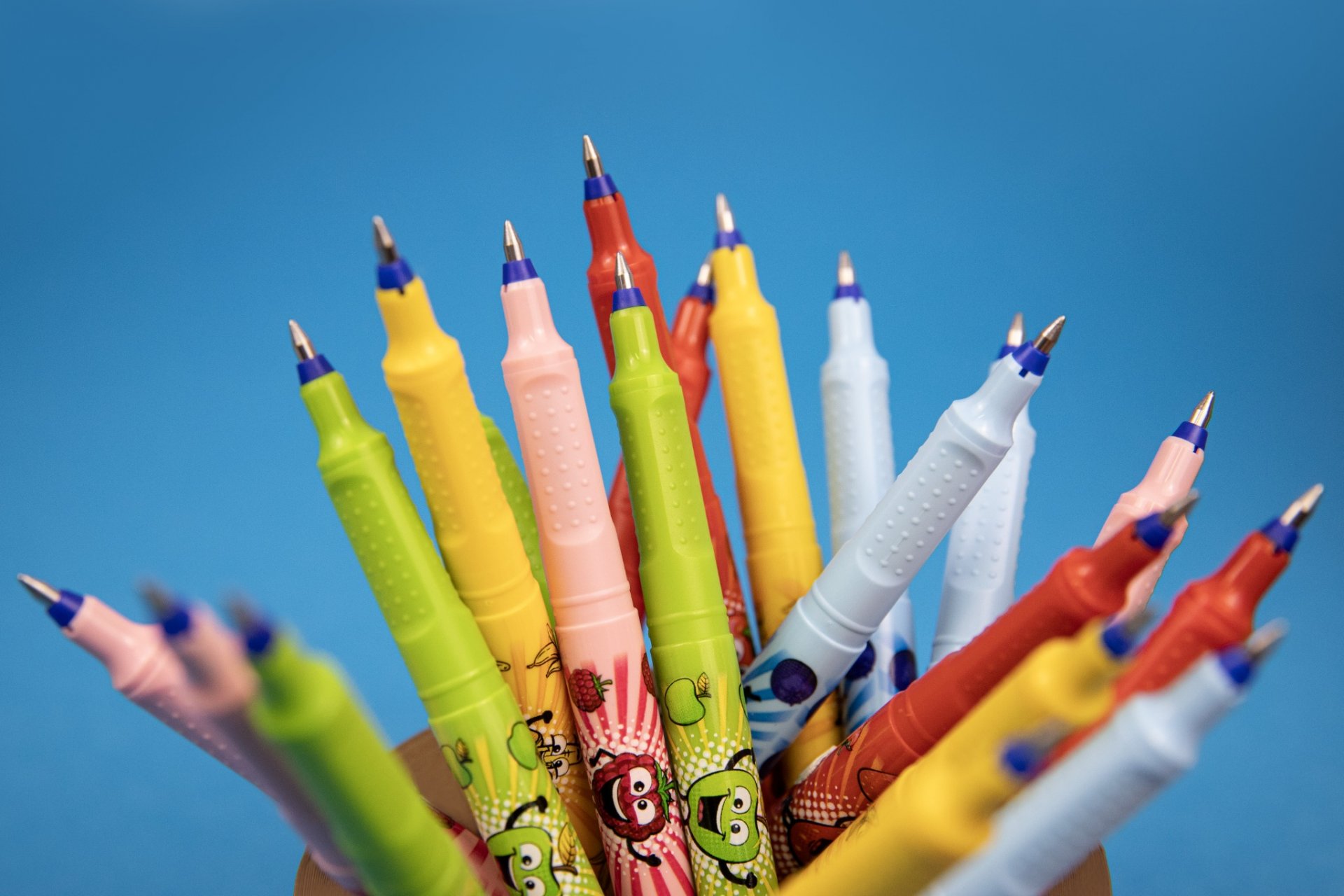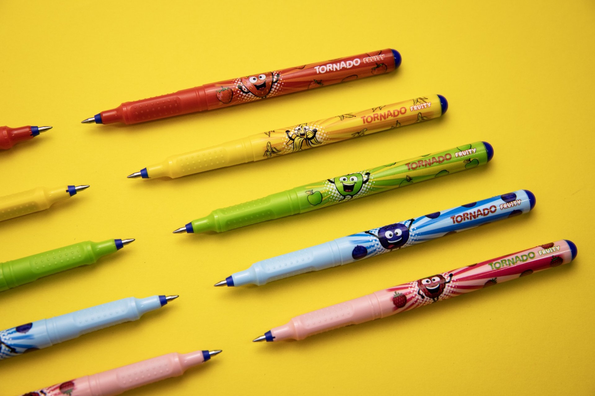 Roller pre školákov s ergonomickým držaním a masážnymi bodmi s modrým zmizíkovateľným a súčasne parfémovaným (banán, jablko, jahoda, malina, čučoriedka) atramentom. Pre ľavákov, pravákov i dysgrafikov. Šírka stopy 0,3 mm. Dodávaný v displeji 5 x 4 ks.