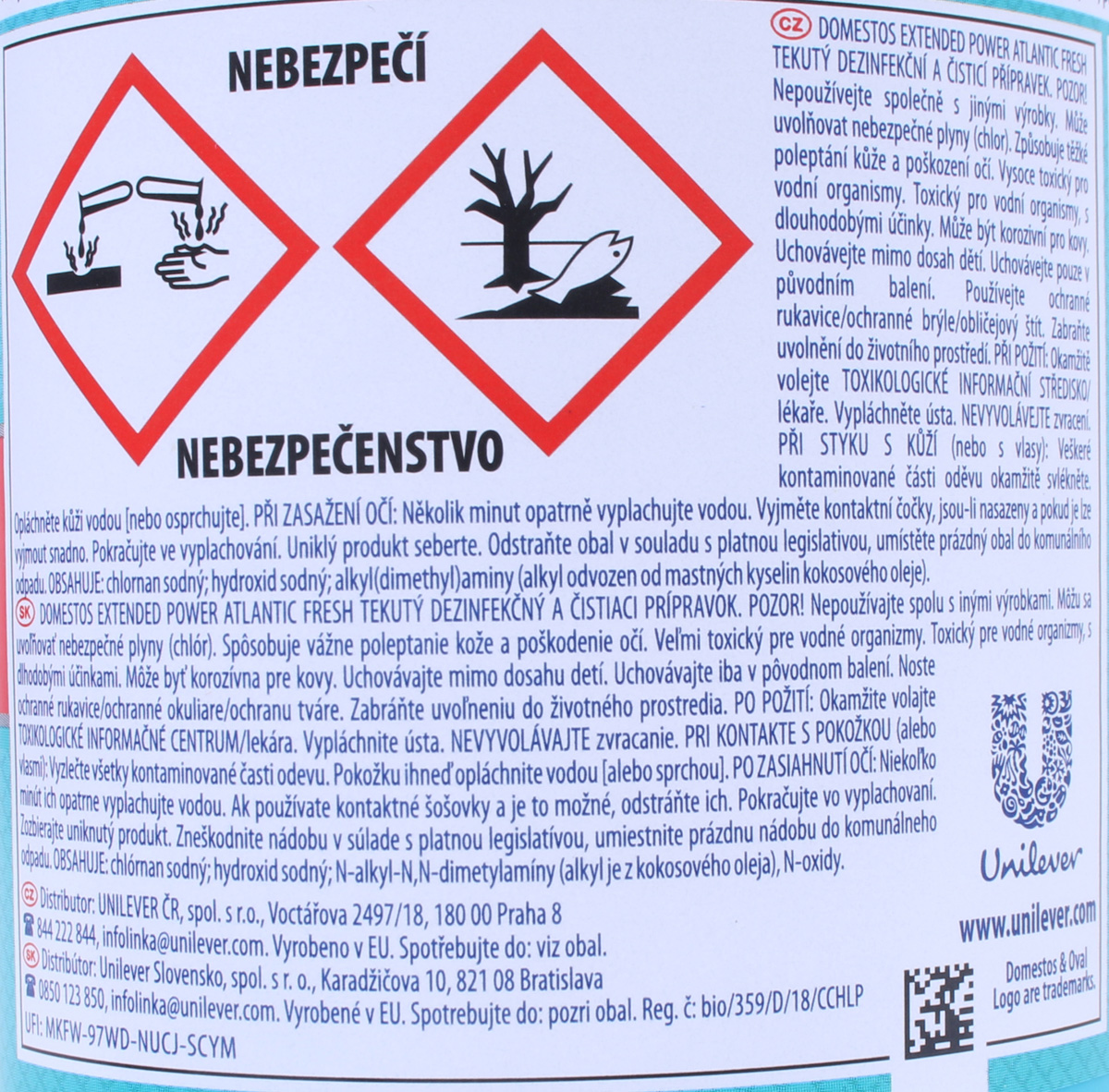 POZOR! Nepoužívajte spolu s inými výrobkami. Môžu sa uvoľňovať nebezpečné plyny (chlór). Spôsobuje vážne poleptanie kože a poškodenie očí. Veľmi toxický pre vodné organizmy. Môže byť korozívna pre kovy. Uchovávajte mimo dosahu detí. Uchovávajte iba v pôvodnej nádobe. Zabráňte uvoľneniu do životného prostredia. Noste ochranné rukavice/ochranný odev/ochranné okuliare/ochranu tváre. PRI KONTAKTE S POKOŽKOU (alebo vlasmi): Všetky kontaminované časti odevu okamžite vyzlečte. Pokožku opláchnite vodou/sprchou. PO ZASIAHNUTÍ OČÍ: Niekoľko minút ich opatrne vyplachujte vodou. Ak používate kontaktné šošovky a ak je to možné, odstráňte ich. Pokračujte vo vyplachovaní. Okamžite volajte TOXIKOLOGICKÉ INFORMAČNÉ CENTRUM/lekára. Zozbierajte uniknutý produkt. OBSAHUJE: chlórnan sodný; hydroxid sodný; N-alkyl-N,N-dimetylamíny (alkyl je z kokosového oleja), N-oxidy.