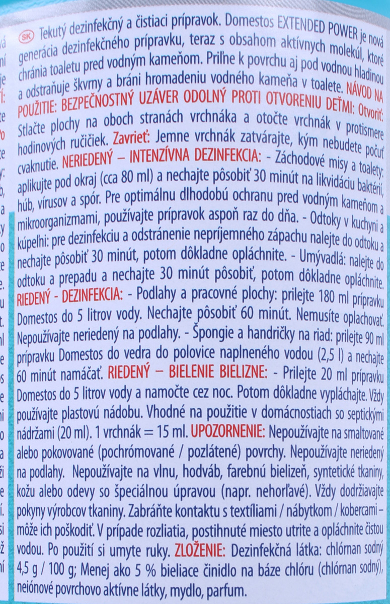 Hustý gel a úsporné dávkovanie odstraňuje mastnotu, zažranú špinu a škvrny. Ničí všetky baktérie. Domestos Extended Power je nová generácia dezinfekčného prípravku, teraz s obsahom aktívnych molekúl, ktoré chránia toaletu pred vodným kameňom. Priľne k povrchu aj pod vodnou hladinou a odstraňuje škvrny a bráni hromadeniu vodného kameňa v toalete. Objem 750 ml.
