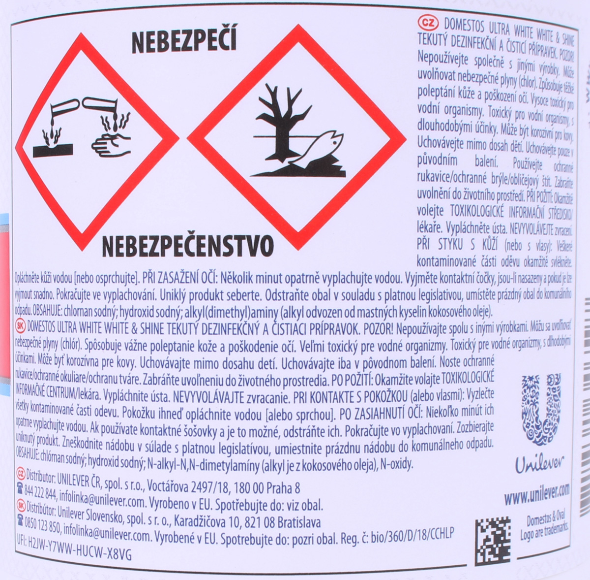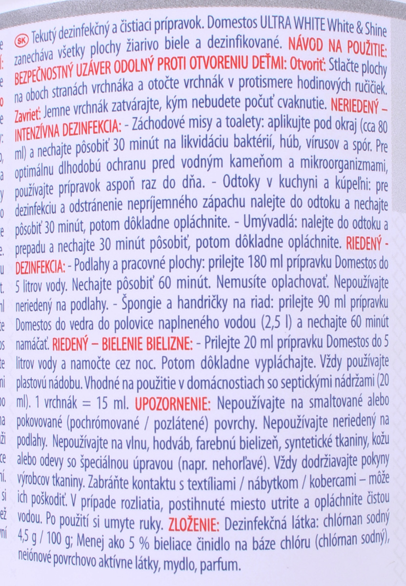 DOMESTOS ULTRA WHITE POZOR! Nepoužívajte spolu s inými výrobkami. Môžu sa uvoľňovať nebezpečné plyny (chlór). Spôsobuje vážne poleptanie kože a poškodenie očí. Veľmi toxický pre vodné organizmy. Môže byť korozívna pre kovy. Uchovávajte mimo dosahu detí. Uchovávajte iba v pôvodnej nádobe. Zabráňte uvoľneniu do životného prostredia. Noste ochranné rukavice/ochranný odev/ochranné okuliare/ochranu tváre. PRI KONTAKTE S POKOŽKOU (alebo vlasmi): Všetky kontaminované časti odevu okamžite vyzlečte. Pokožku opláchnite vodou/sprchou. PO ZASIAHNUTÍ OČÍ: Niekoľko minút ich opatrne vyplachujte vodou. Ak používate kontaktné šošovky a ak je to možné, odstráňte ich. Pokračujte vo vyplachovaní. Okamžite volajte TOXIKOLOGICKÉ INFORMAČNÉ CENTRUM/lekára. Zozbierajte uniknutý produkt. OBSAHUJE: chlórnan sodný; hydroxid sodný; N-alkyl-N,N-dimetylamíny (alkyl je z kokosového oleja), N-oxidy.