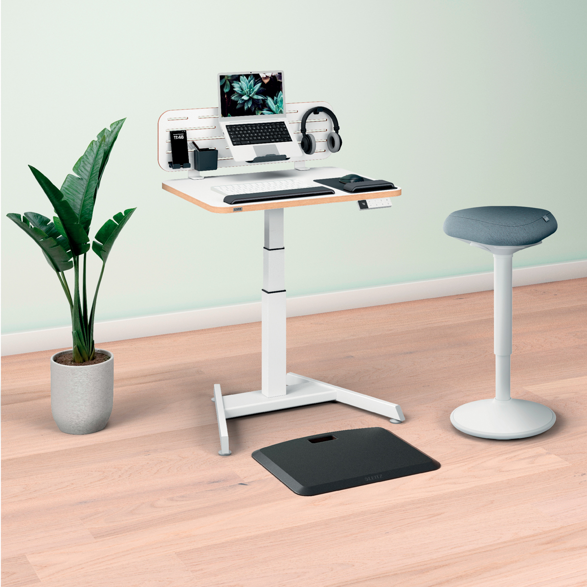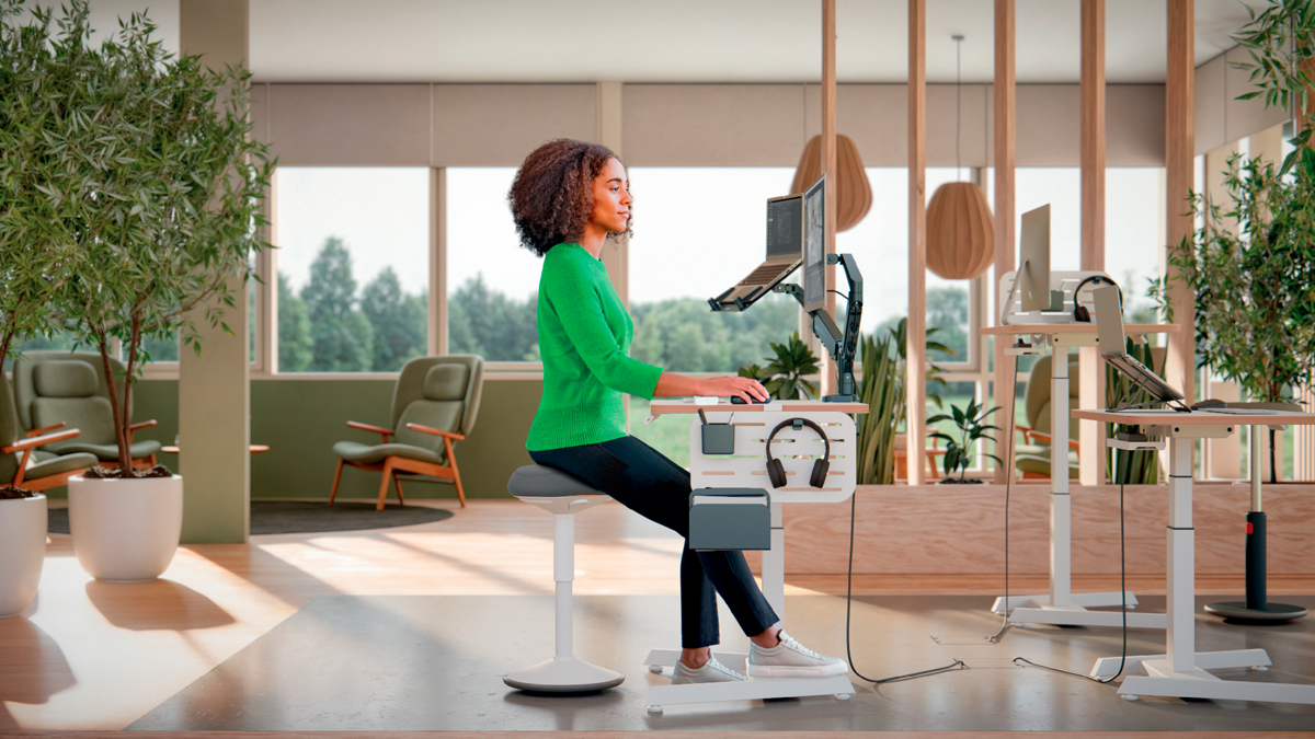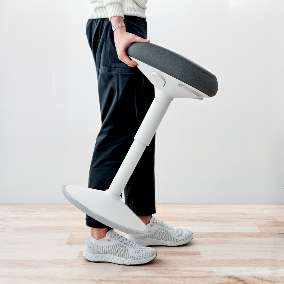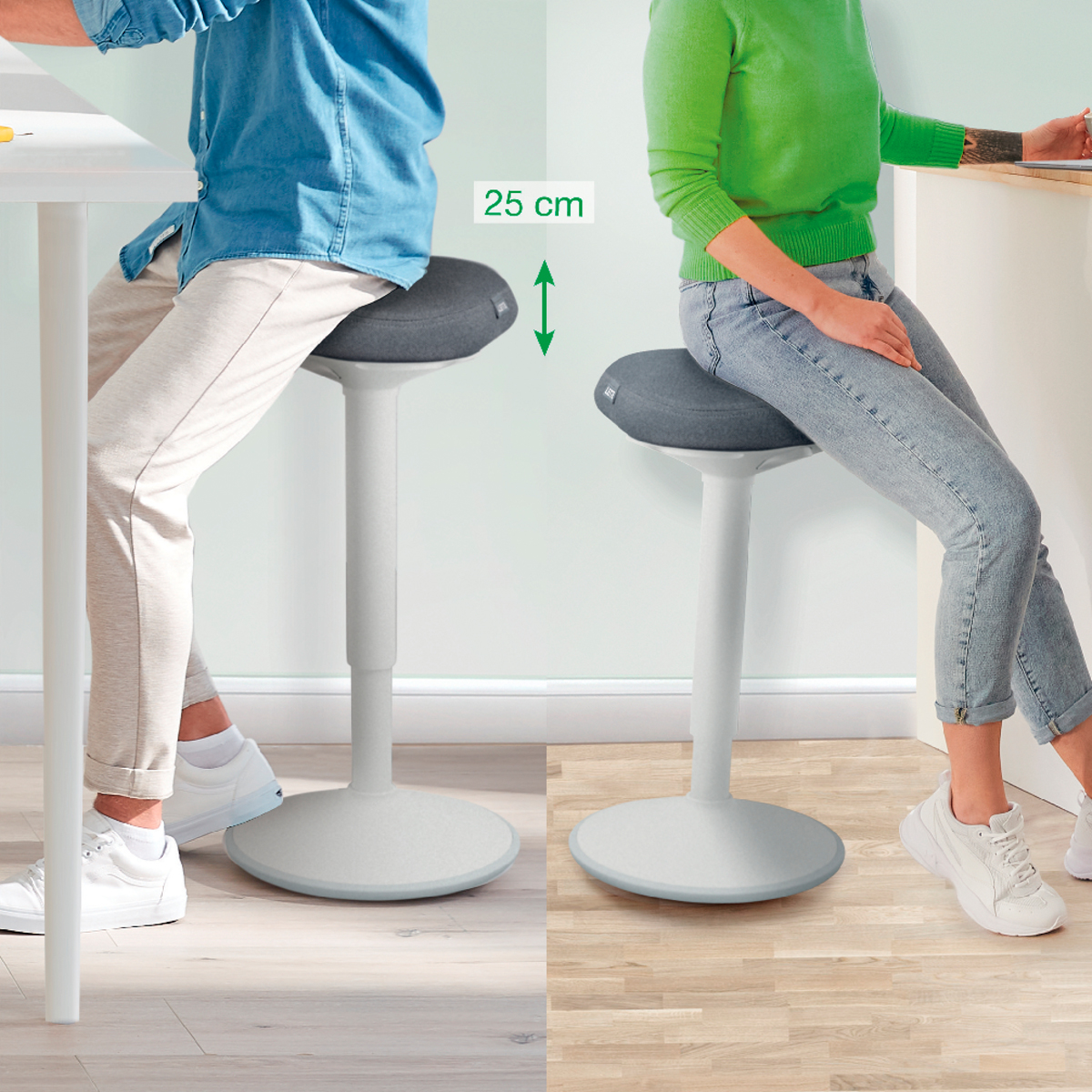Pre perfektnú oporu v stoji pri stoloch na sedenie/st alebo pri vysokých rokovacích stoloch vďaka perfektnému výškovému nastaveniu pre každú telesnú výšku