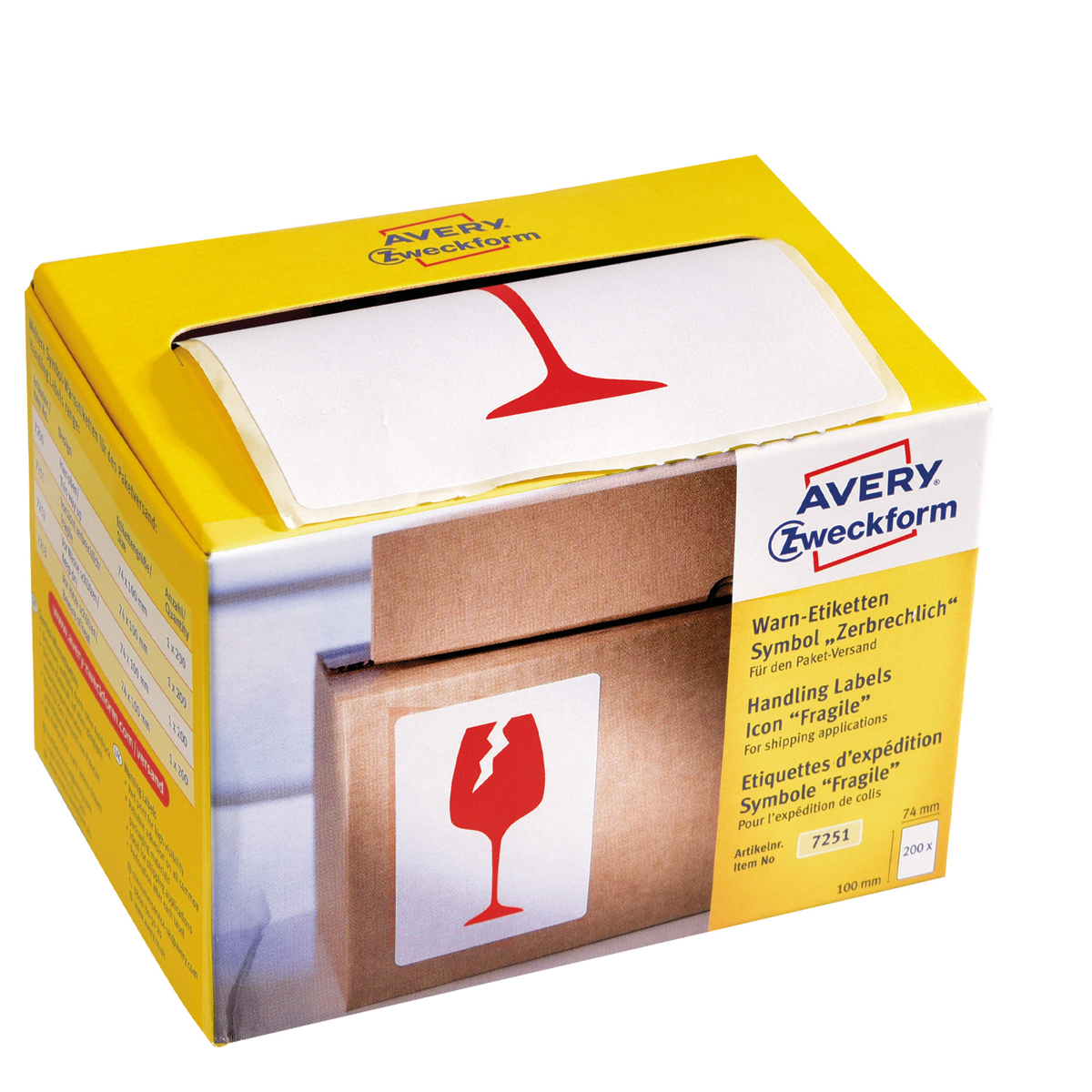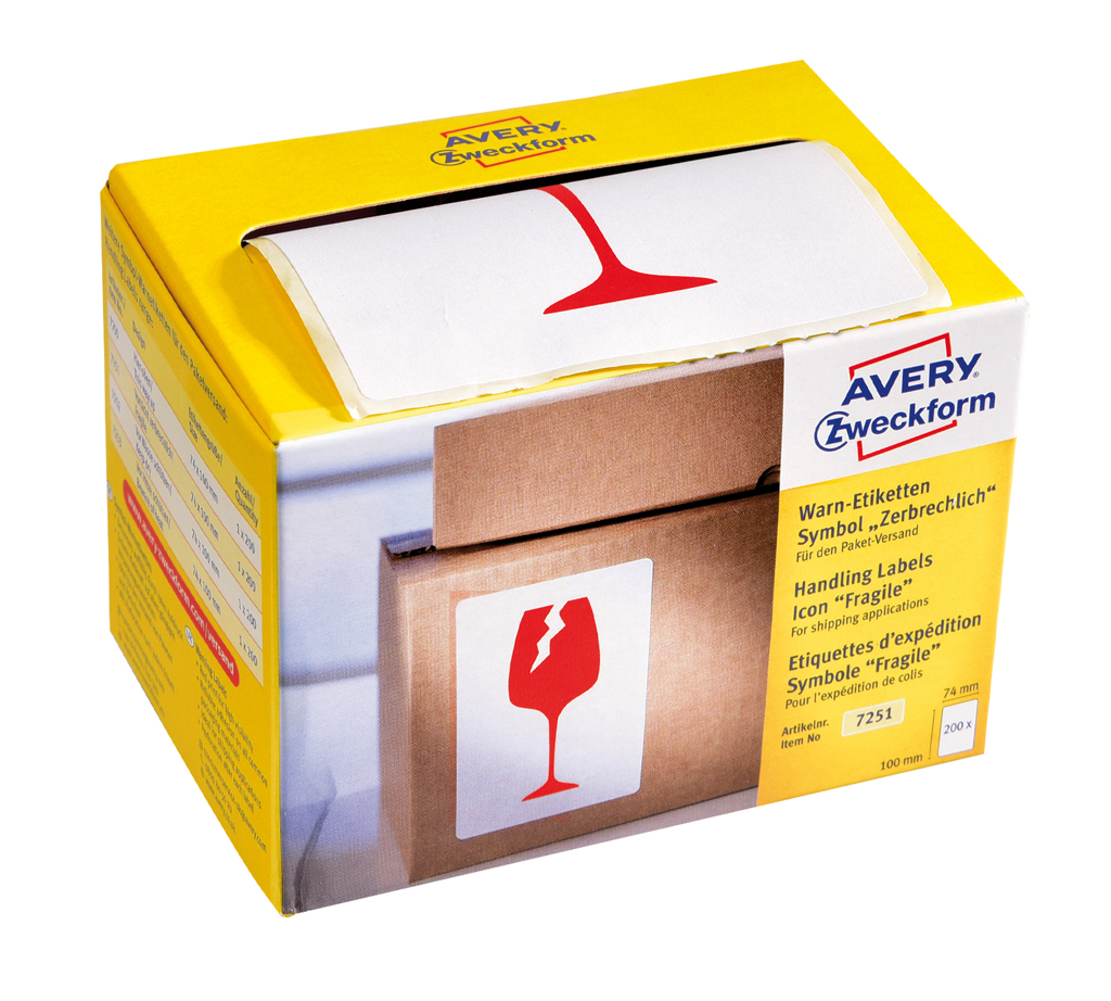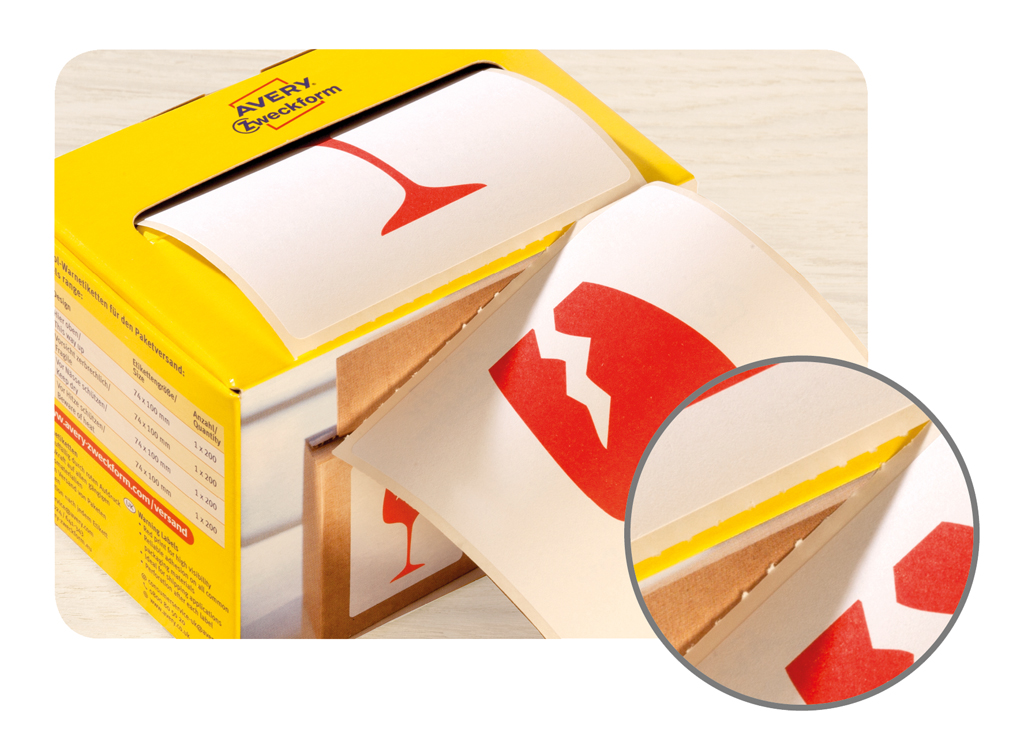 Etikety Avery s varovným symbolom ’ Krehké’ 74x100mm na kotúči