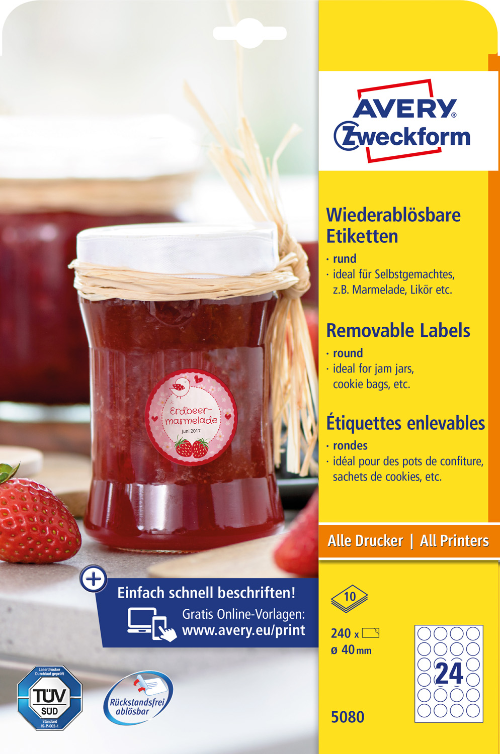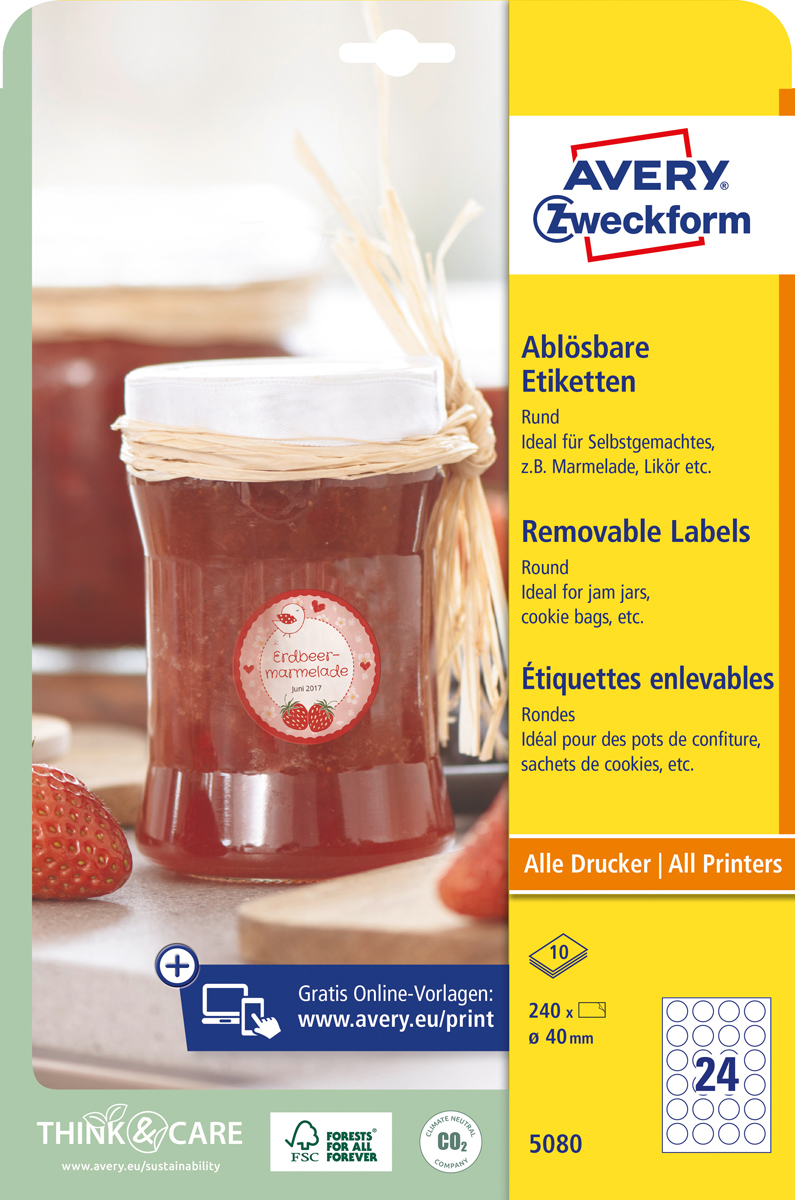 od konkurencie. Spoľahlivá priľnavosť ku sklu, fólii aj papieru. Ľahké odlepenie etikiet bez zanechania stôp po lepidle. Vhodné pre všetky druhy tlačiarní. Šablóny a softvér pre tlač etikiet zadarmo – výber z prázdnych či už navrhnutých, moderných