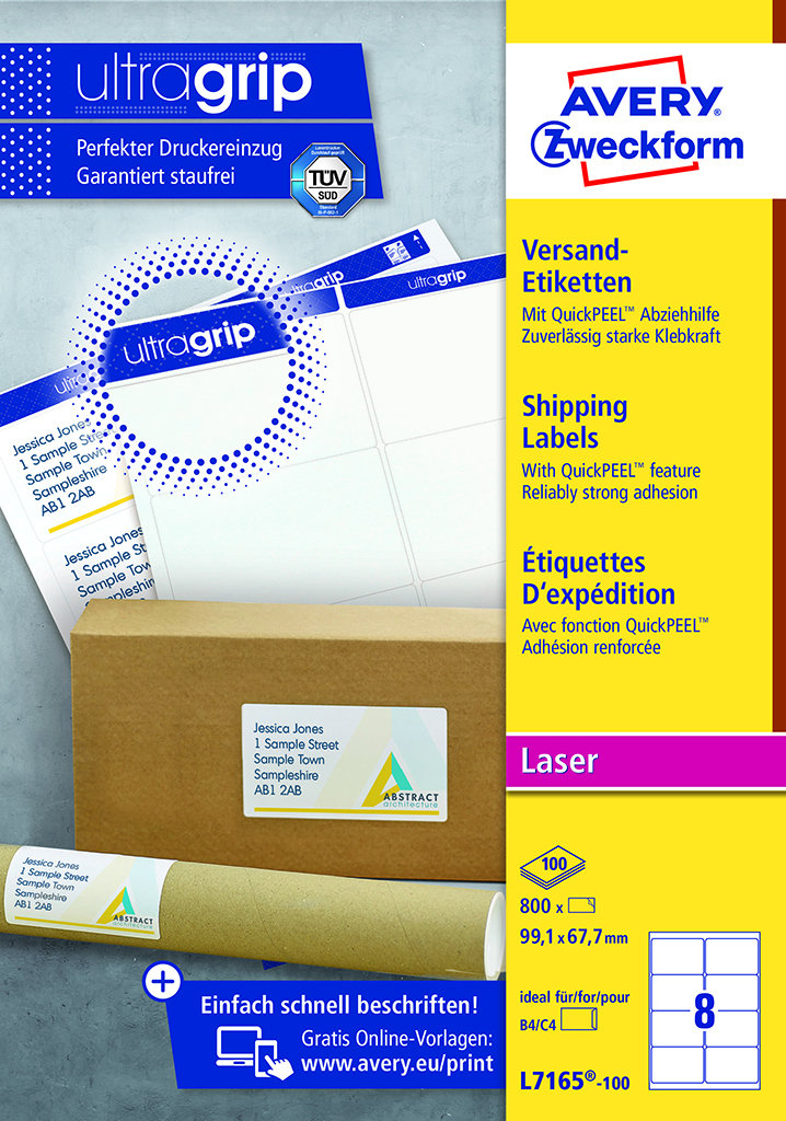 Biele etikety vhodné ako prepravné štítky na zásielky. Vďaka inovatívnej technológii ultragrip sa môžete spoľahnúť na bezchybné natiahnutie archu a tlač bez zasekávania. Bezpečnostný okraj QCT zabraňuje zanášaniu tlačiarne lepidlom. Rýchla technológia QuickPEEL™ zabezpečí, že etiketu odlepíte z podkladového papiera za sekundu. Šablóny a softvér pre jednoduchú a rýchlu tlač etikiet sú k dispozícii zdarma na www.avery-zweckform.cz/software/avery-design-print. Sú vhodné pre všetky štandardné laserové tlačiarne. Pre laserové tlačiarne testované a certifikované TÜV SÜD. Rozmer 99,1 x 67,7 mm. Balenie 100 hárkov.