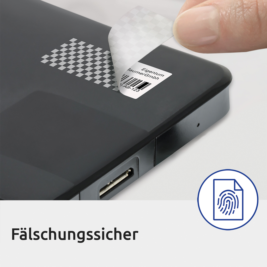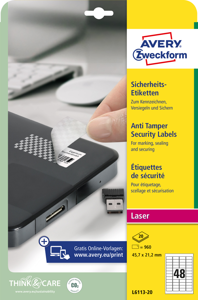 Etikety Avery Zweckform s ochranou proti manipulácii oceníte predovšetkým pri označovaní hodnotných predmetov, kancelárskeho nábytku alebo elektroniky. Pokiaľ sa etikety niekto snaží odstrániť, zanechávajú po sebe viditeľný šachovnicový vzor. Nie je možné ich znovu nalepiť, takže akákoľvek manipulácia je ihneď zrejmá. Rozmer 45,7 x 21,2 mm, 960 etikiet.