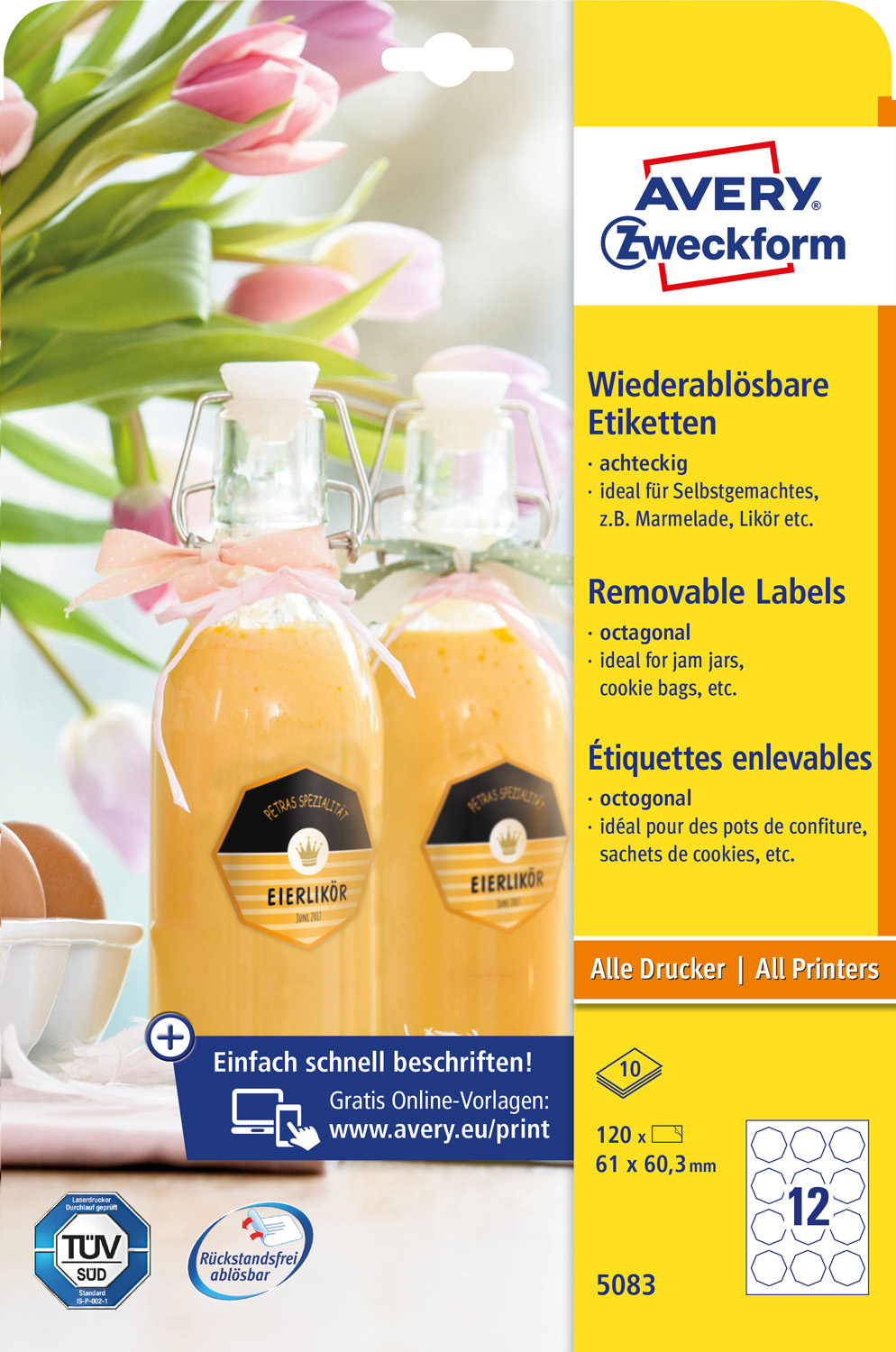 od konkurencie. Spoľahlivá priľnavosť ku sklu, fólii aj papieru. Ľahké odlepenie etikiet bez zanechania stôp po lepidle. Vhodné pre všetky druhy tlačiarní. Šablóny a softvér pre tlač etikiet zadarmo – výber z prázdnych či už navrhnutých, moderných