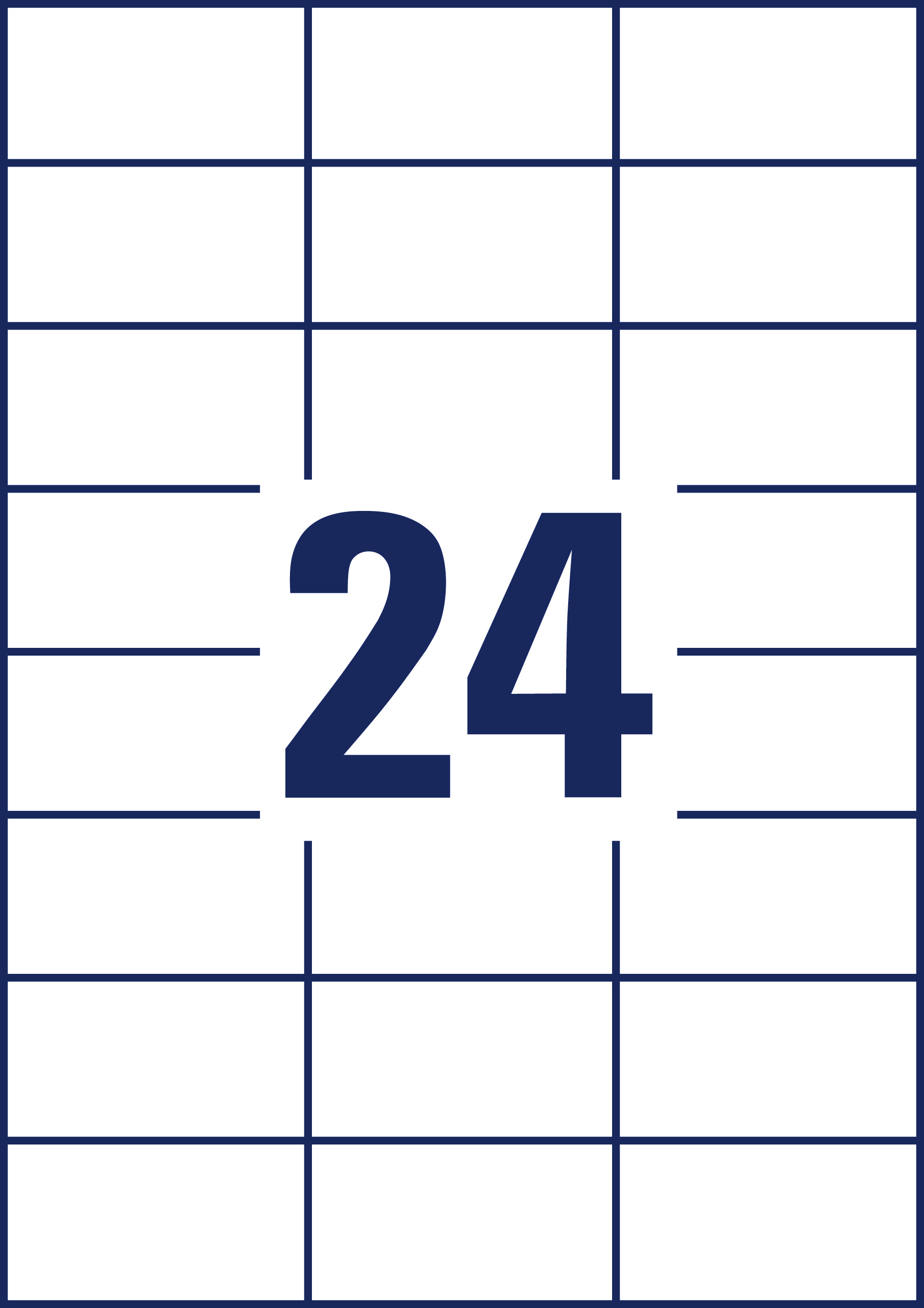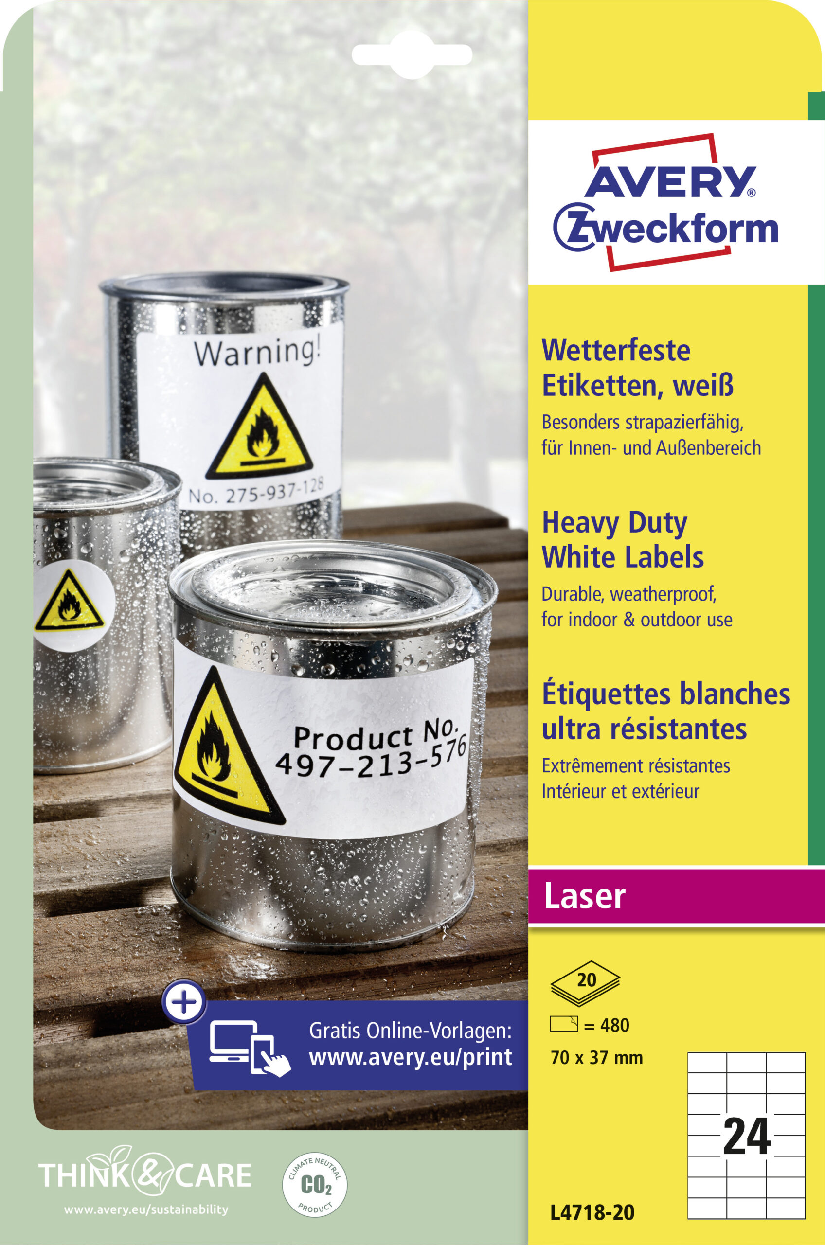 Veľmi odolné polyesterové etikety odolné voči oleju, prachu, špine, natrhnutiu, vode. Odolné voči teplotám od -20° do +80°C. Sú určené pre tlač v laserových tlačiarňach a sú vhodné aj pre vonkajšie použitie. Rozmery v mm : 70 × 37. Farba biela. Etikety na hárku 24 kusov. Balenie 20 hárkov.
