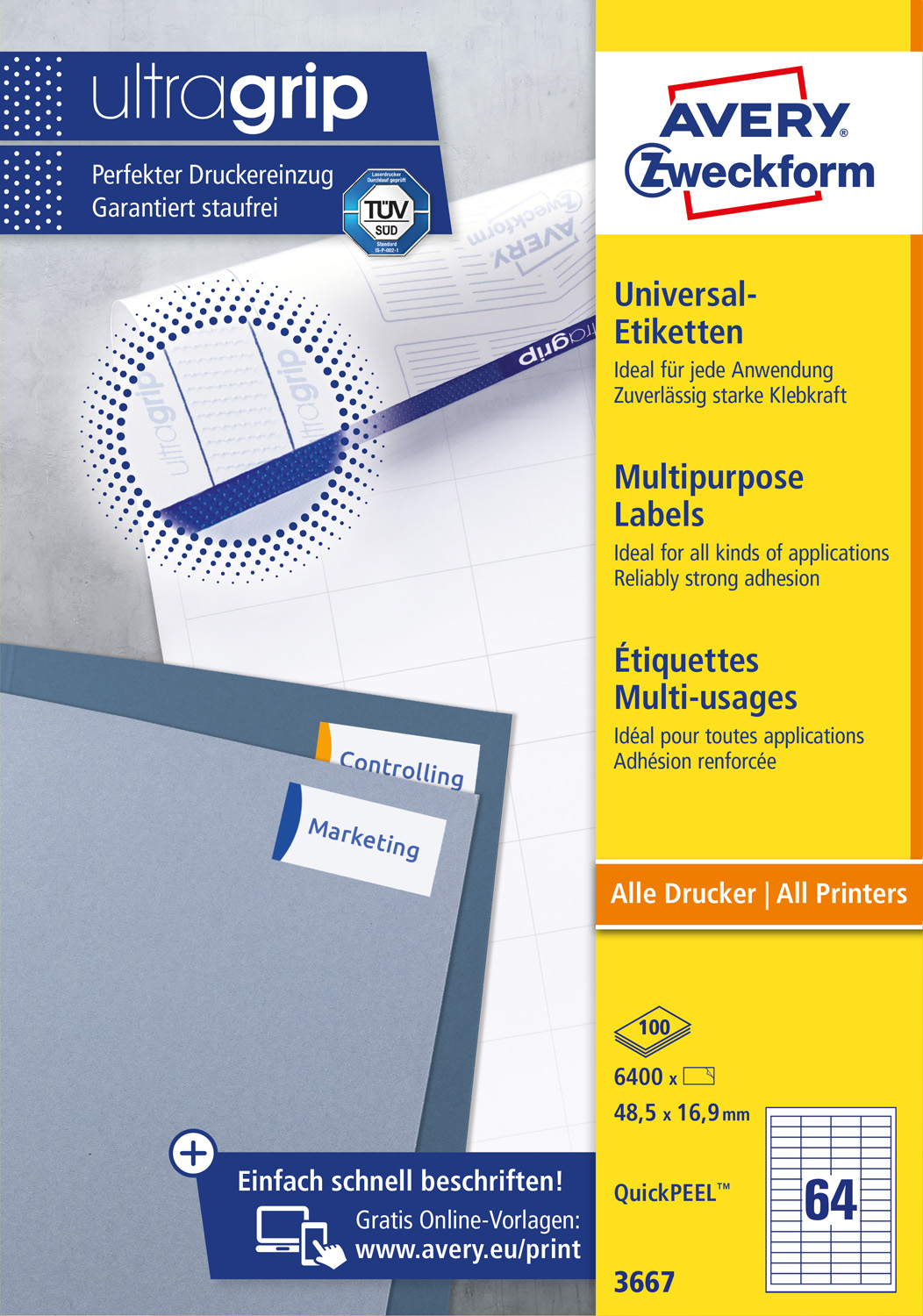 Biele univerzálne etikety vhodné na každodenné použitie v atramentových a laserových tlačiarňach a kopírovacích strojoch. Vďaka inovatívnej technológie ultragrip sa môžete spoľahnúť na bezchybné natiahnutie archu a tlač bez zasekávania. Bezpečnostný okraj QCT zabraňuje zanášaniu tlačiarne lepidlom. Pre laserové tlačiarne testované a certifikované TÜV SÜD. Vysoká lepivosť na rôznych povrchoch. Ostrá tlač bez bez rozmazávania. Etikety sú vyrobené spôsobom šetrným k životnému prostrediu, majú certifi káciu FSC®, sú bielené bez použitia chlóru. Šablóny a softvér pre jednoduchú a rýchlu tlač etikiet k dispozícii zdarma. Formát A4. Balenie 100 hárkov.