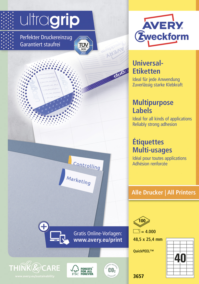 Biele univerzálne etikety vhodné na každodenné použitie v atramentových a laserových tlačiarňach a kopírovacích strojoch. Vďaka inovatívnej technológie ultragrip sa môžete spoľahnúť na bezchybné natiahnutie archu a tlač bez zasekávania. Bezpečnostný okraj QCT zabraňuje zanášaniu tlačiarne lepidlom. Pre laserové tlačiarne testované a certifi kované TÜV SÜD. Vysoká lepivosť na rôznych povrchoch. Ostrá tlač bez bez rozmazávania. Etikety sú vyrobené spôsobom šetrným k životnému prostrediu, majú certifi káciu FSC®, sú bielené bez použitia chlóru. Šablóny a softvér pre jednoduchú a rýchlu tlač etikiet k dispozícii zdarma. U niektorých rozmerov systém QuickPEEL™ na rýchlejšie odlepenie etikiet. Formát A4. Balenie 100 hárkov. Farba biela.
