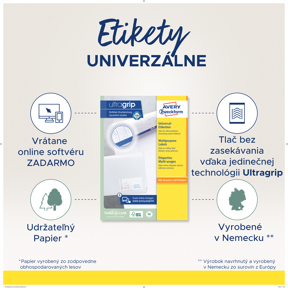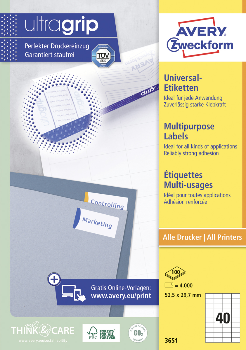 Biele univerzálne etikety vhodné na každodenné použitie v atramentových a laserových tlačiarňach a kopírovacích strojoch. Vďaka inovatívnej technológie ultragrip sa môžete spoľahnúť na bezchybné natiahnutie archu a tlač bez zasekávania. Bezpečnostný okraj QCT zabraňuje zanášaniu tlačiarne lepidlom. Pre laserové tlačiarne testované a certifi kované TÜV SÜD. Vysoká lepivosť na rôznych povrchoch. Ostrá tlač bez bez rozmazávania. Etikety sú vyrobené spôsobom šetrným k životnému prostrediu, majú certifi káciu FSC®, sú bielené bez použitia chlóru. Šablóny a softvér pre jednoduchú a rýchlu tlač etikiet k dispozícii zdarma. U niektorých rozmerov systém QuickPEEL™ na rýchlejšie odlepenie etikiet. Formát A4. Balenie 100 hárkov. Farba biela.