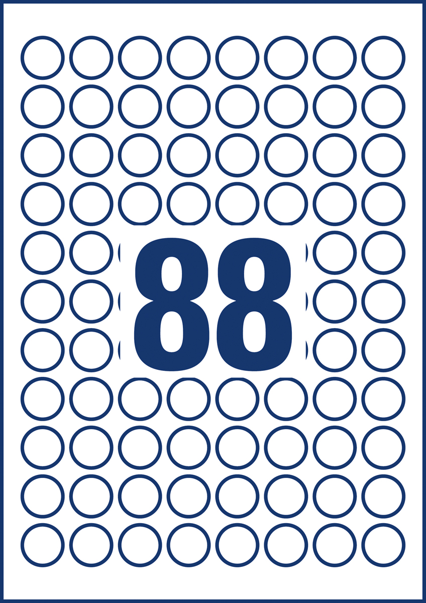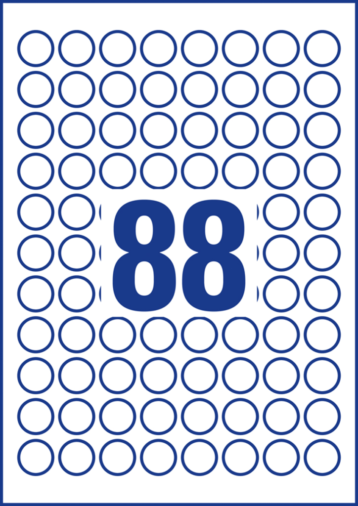 Biele kruhové univerzálne etikety vhodné na každodenné použitie v atramentových a laserových tlačiarňach a kopírovacích strojoch. Ostrá tlač bez bez rozmazávania. Etikety su vyrobené spôsobom šetrným k životnému prostrediu, majú certifikáciu FSCR, sú bielené bez použitia chlóru. Šablóny a softvér pre jednoduchú a rýchlu tlač etikiet k dispozícii zdarma. Formát A4. Balenie 10 hárkov. Priemer 20 mm.