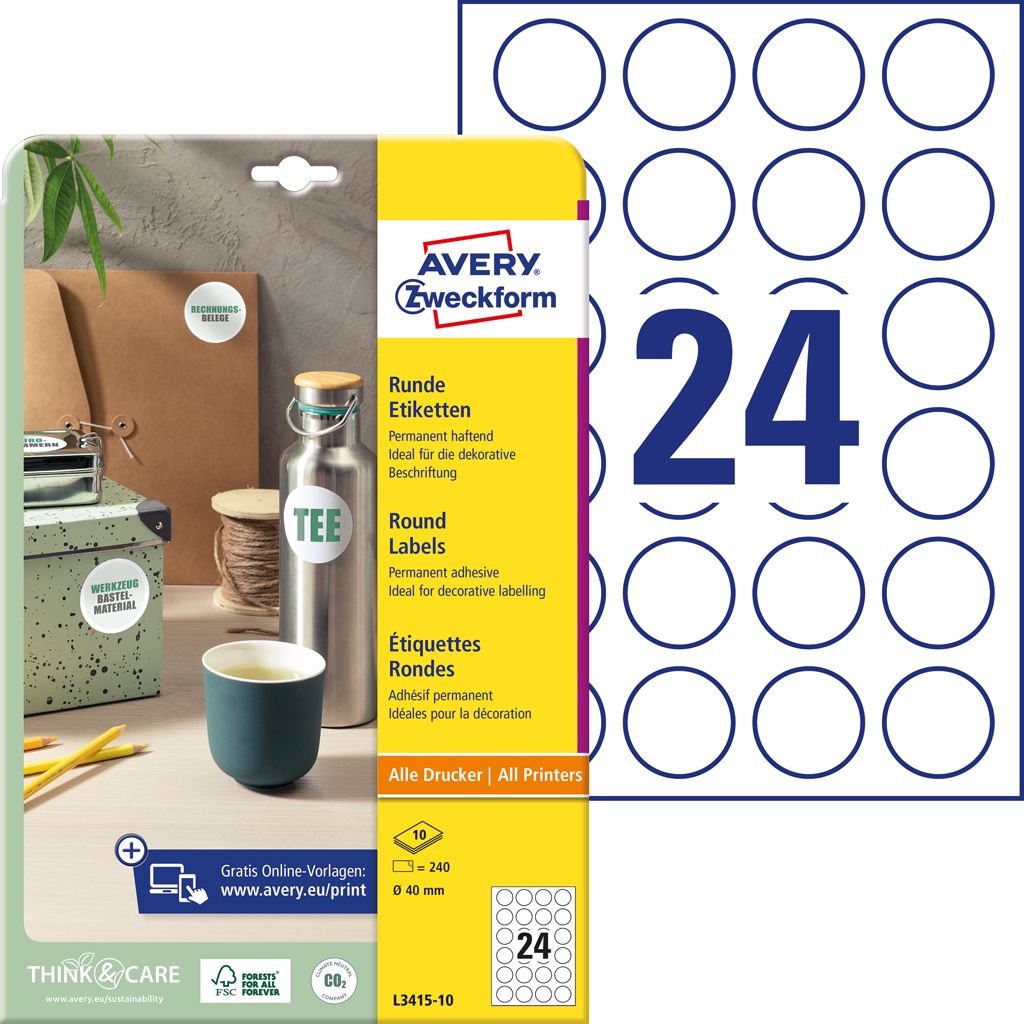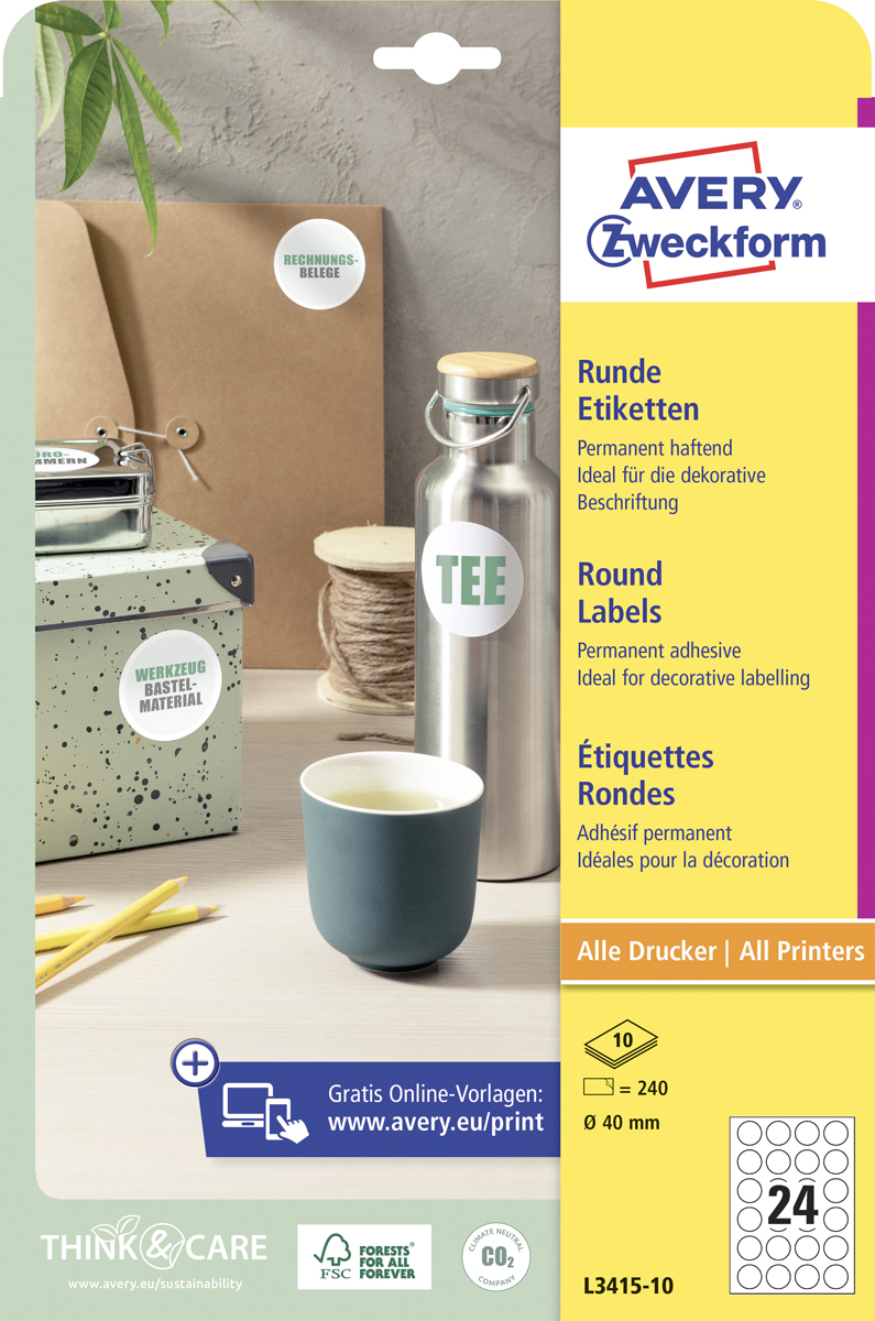 Biele kruhové univerzálne etikety vhodné na každodenné použitie v atramentových a laserových tlačiarňach a kopírovacích strojoch. Ostrá tlač bez bez rozmazávania. Etikety su vyrobené spôsobom šetrným k životnému prostrediu, majú certifikáciu FSCR, sú bielené bez použitia chlóru. Šablóny a softvér pre jednoduchú a rýchlu tlač etikiet k dispozícii zdarma. Formát A4. Balenie 40 hárkov. Priemer 10 mm.