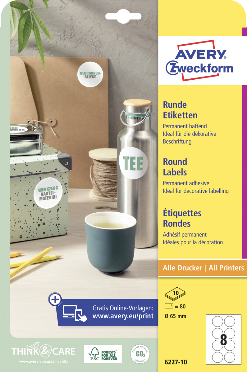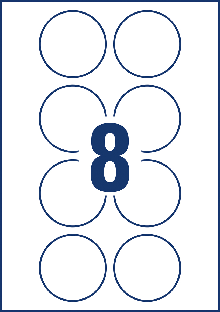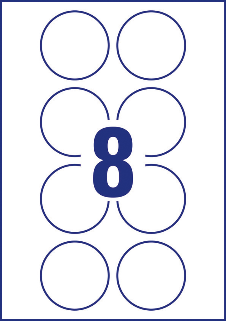 Biele kruhové univerzálne etikety vhodné na každodenné použitie v atramentových a laserových tlačiarňach a kopírovacích strojoch. Ostrá tlač bez bez rozmazávania. Etikety su vyrobené spôsobom šetrným k životnému prostrediu, majú certifikáciu FSCR, sú bielené bez použitia chlóru. Šablóny a softvér pre jednoduchú a rýchlu tlač etikiet k dispozícii zdarma. Formát A4. Balenie 10 hárkov. Priemer 65 mm.