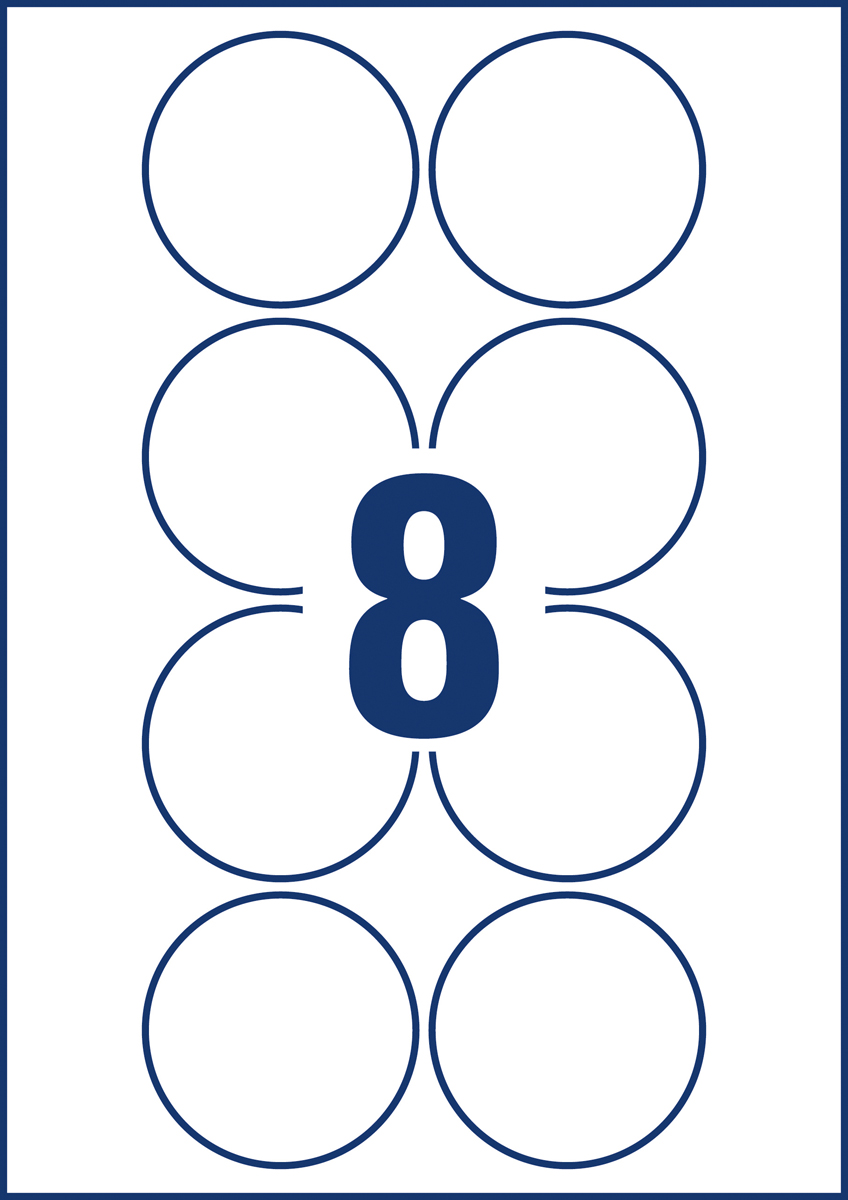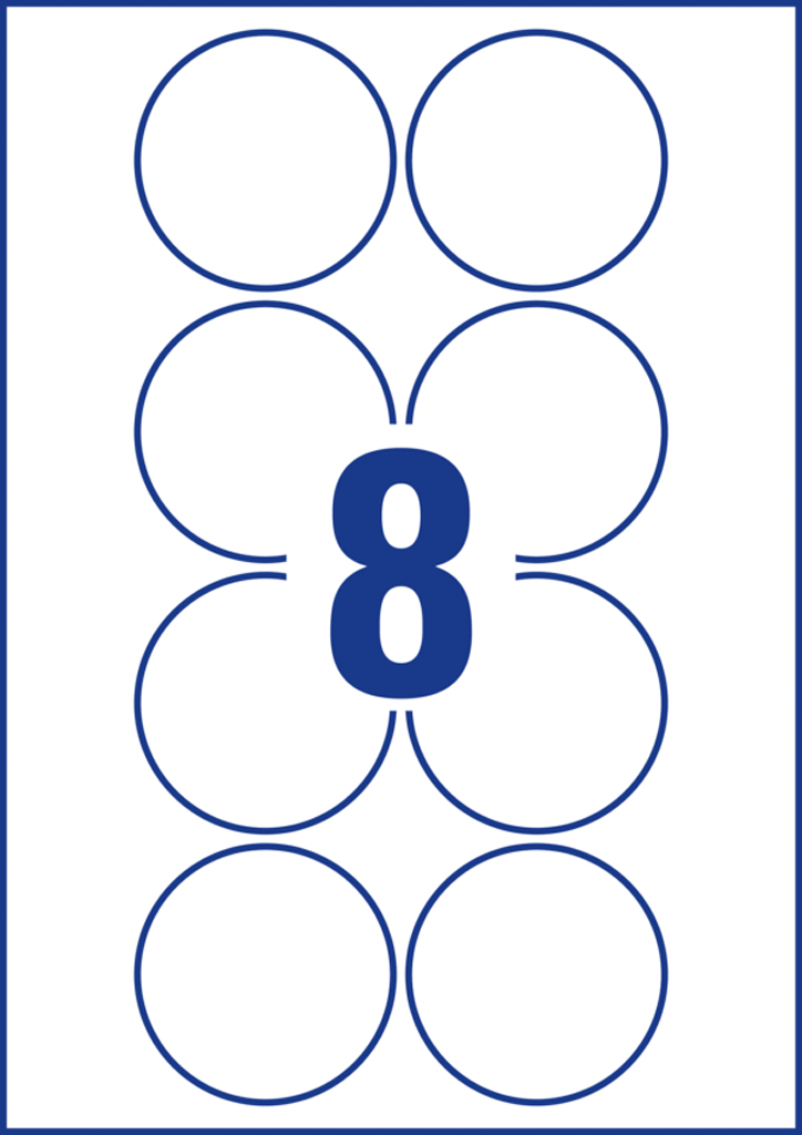 Biele kruhové univerzálne etikety vhodné na každodenné použitie v atramentových a laserových tlačiarňach a kopírovacích strojoch. Ostrá tlač bez bez rozmazávania. Etikety su vyrobené spôsobom šetrným k životnému prostrediu, majú certifikáciu FSCR, sú bielené bez použitia chlóru. Šablóny a softvér pre jednoduchú a rýchlu tlač etikiet k dispozícii zdarma. Formát A4. Balenie 10 hárkov. Priemer 69 mm.
