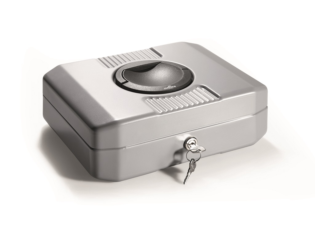 Pokladnička vybavená mincovou priehradkou s ôsmimi oddielmi na eurá a centy v maximálnej hodnote 102,05 Euro. Tri prístupné priehradky na bankovky, priestor na poukážky a stravné lístky v spodnej časti. Sivo-strieborná pokladnička je vyrobená z povrchovo upravenej ocele, všetky vnútorné časti z nárazu vzdorného plastu. Sklápateľné ergonomicky tvarované madlo prispieva k dobrému držaniu, pena na vnútornej strane veka zabraňuje premiešaniu mincí pri prenose, dvojzápadkový zámok zvyšuje bezpečnosť.