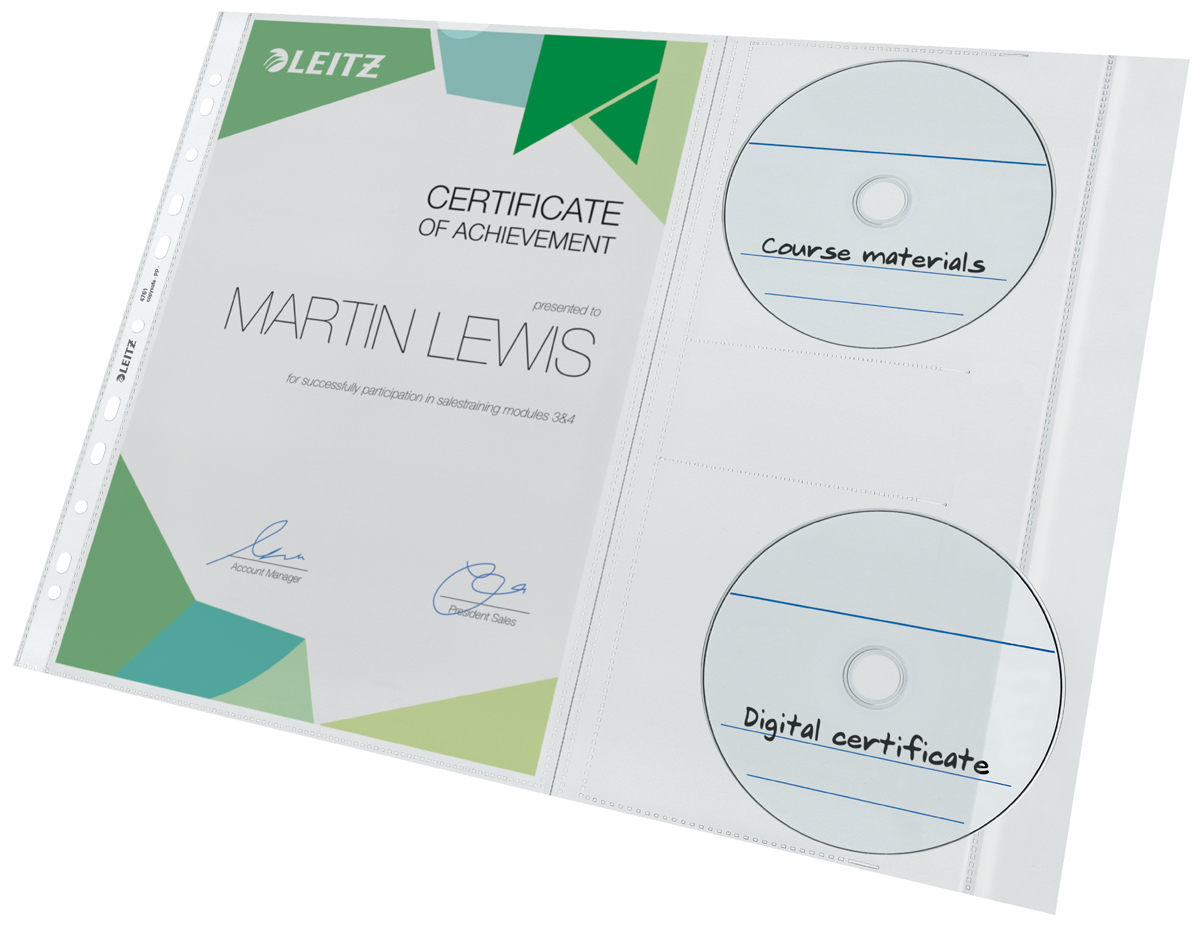 Závesné plastové obaly pre archiváciu dokumentov a zároveň podkladov na CD/DVD v pákových a krúžkových zoraďovačoch. Praktický typ špeciálneho euroobalu formátu A4 s multiperforáciou a 2 vreckami s chlopňou na bezpečné uloženie na CD. CD vkladané z boku. Hrúbka 120 um. Balenie 5 ks. Embosovaná PP fólia 0,13 mm.