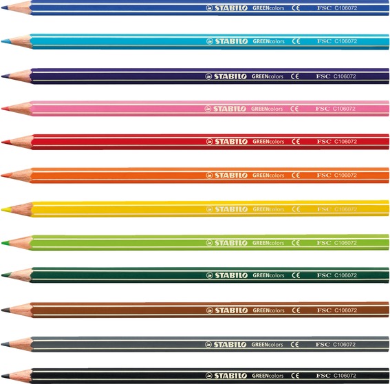 Farbičky STABILO GREENcolors sú vyrobené zo 100% certifikovaného dreva s certifikátom FSC® (Forest Stewardship Council) pochádzajúceho z udržateľných lesov. Kvalitné tuhy s priemerom 3 mm. Klasický šesťhranný tvar s matným lakovaním. Intenzívne žiarivé farby. Sada 12 ks.