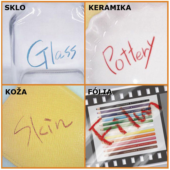 Farebná ceruzka v papierovom obale bez potreby strúhania. Špeciálne vyvinutá tuha takmer na všetky povrchy ako sklo, kovy a plasty. Tuha na olejovej báze. Dĺžka stopy 2000-4000 m, šírka stopy 1 – 4,4 mm.