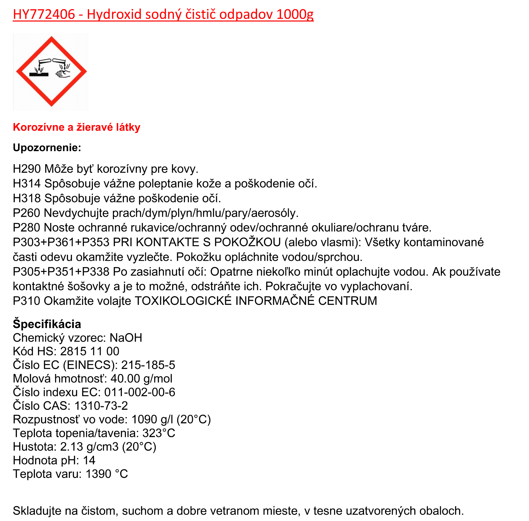 H314 Spôsobuje vážne poleptanie kože a poškodenie očí.