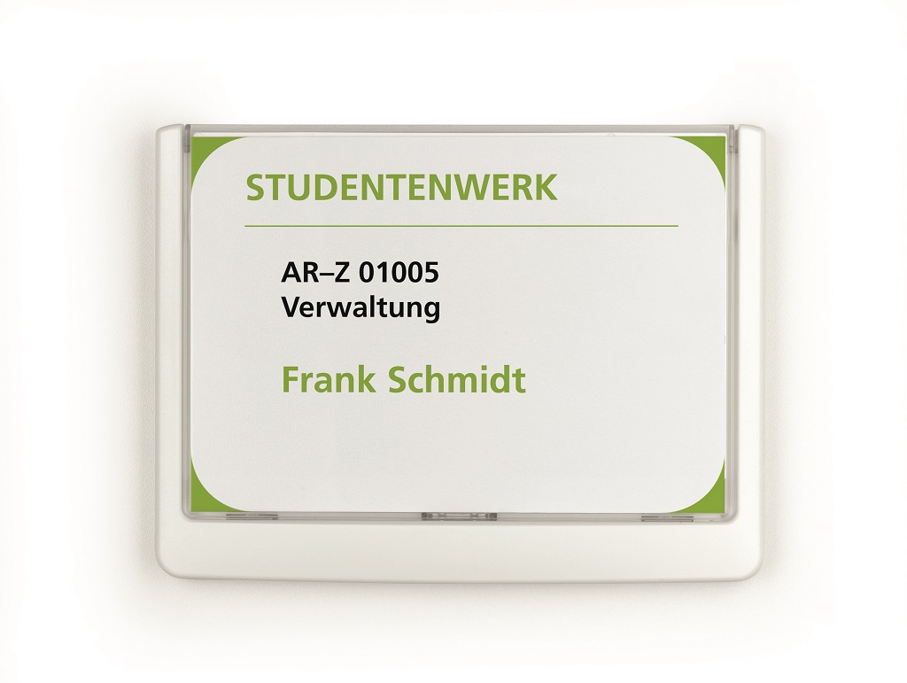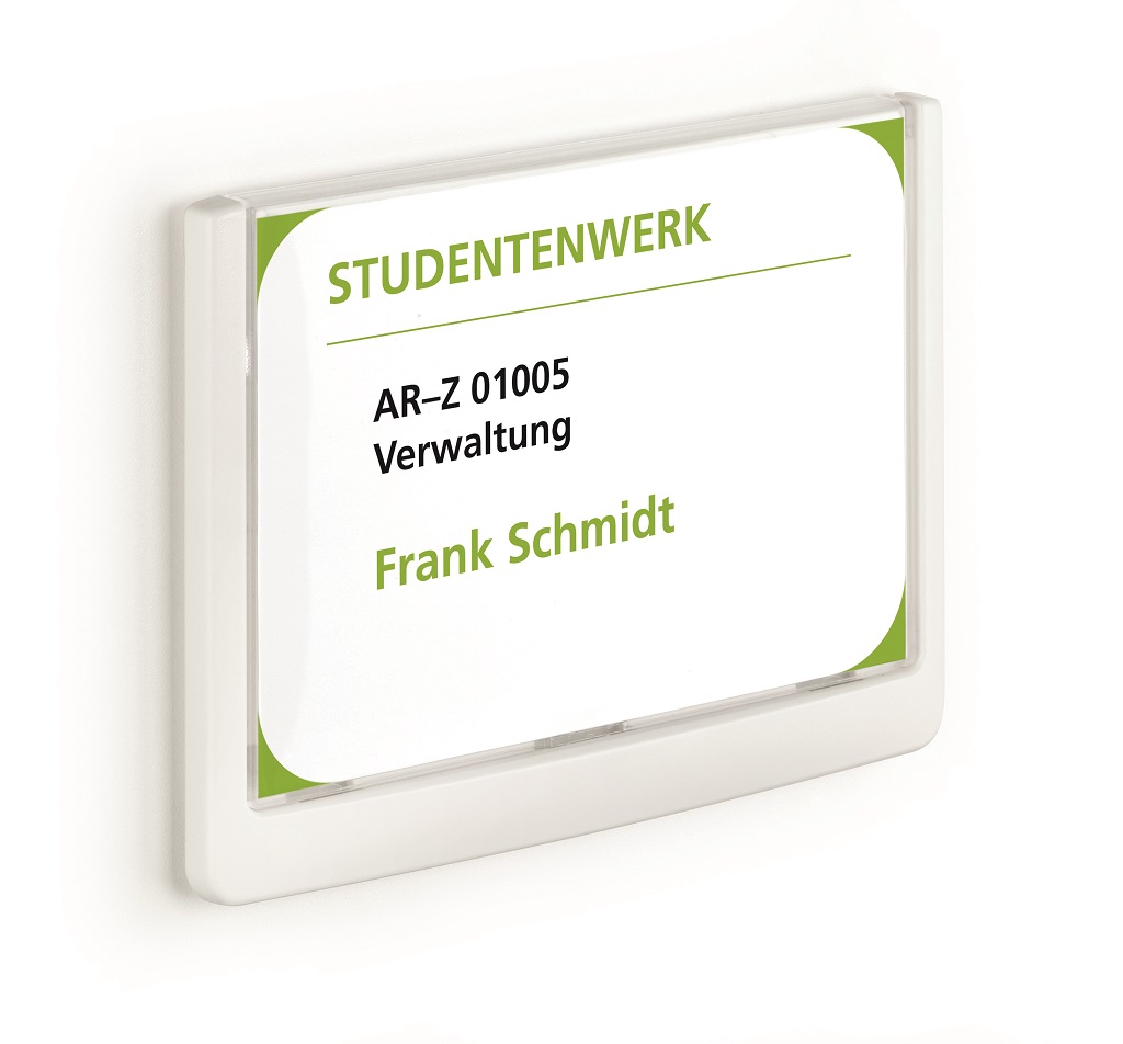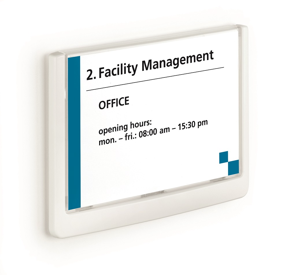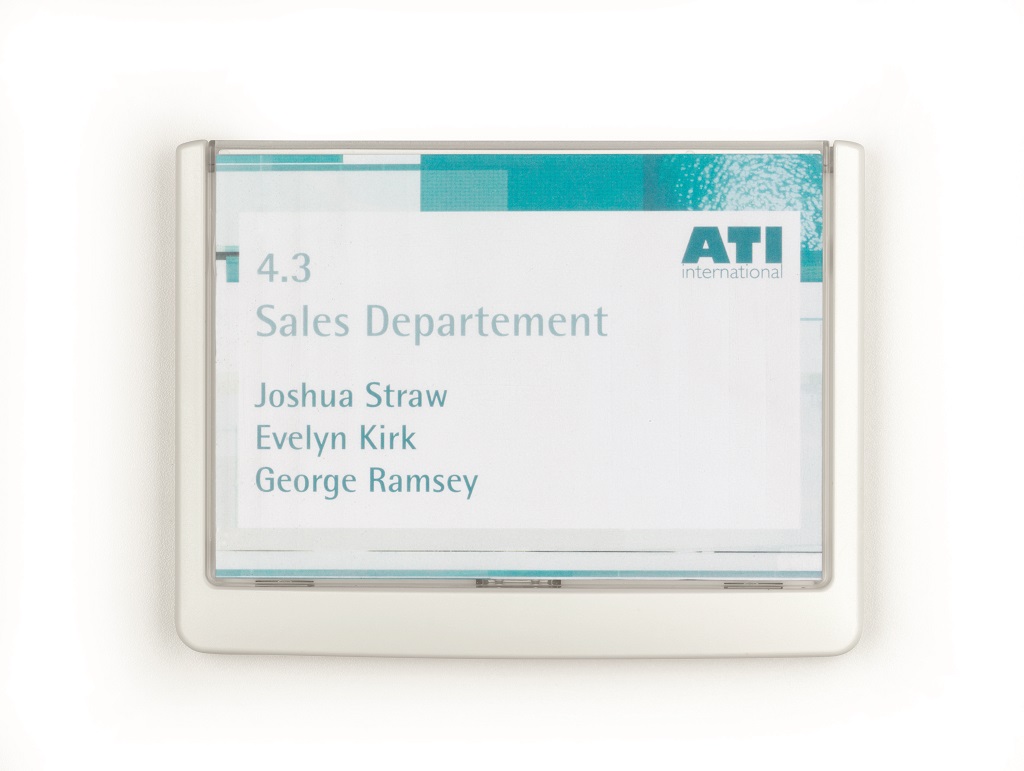 Moderná informačná tabuľka na dvere s lemom v atraktívnej bielej farbe. Predný panel sa otvára na jedno zatlačenie, a tým sa jednoducho sprístupnia vložené popisné papiere, ktoré sa môžu vymieňať podľa potrieb. Tabuľka je ideálna do kancelárií, úradov, škôl, univerzít a hotelov. Súčasťou balenia je montážna sada s názorným návodom. Namiesto pevného montovania môže byť tabuľka k povrchu aj prilepená.