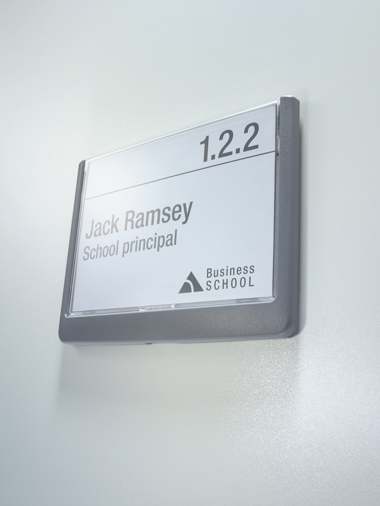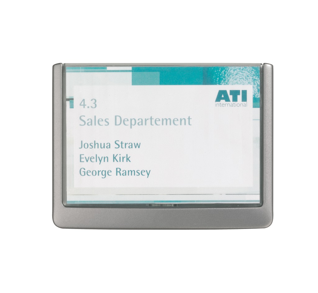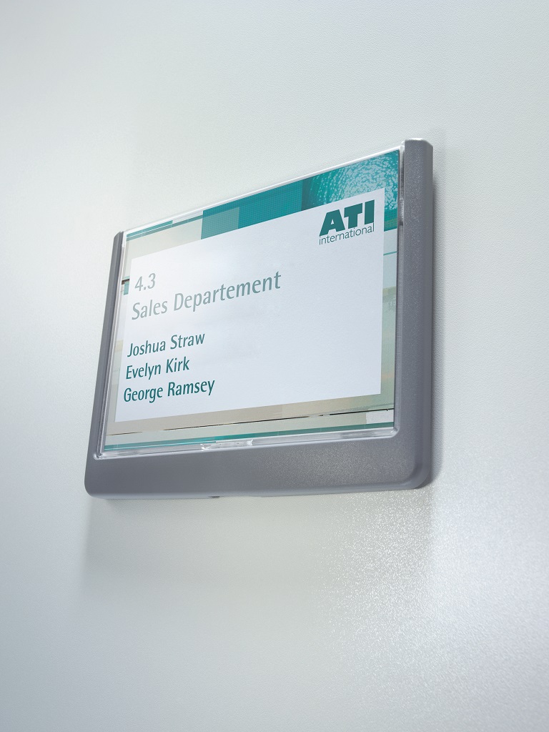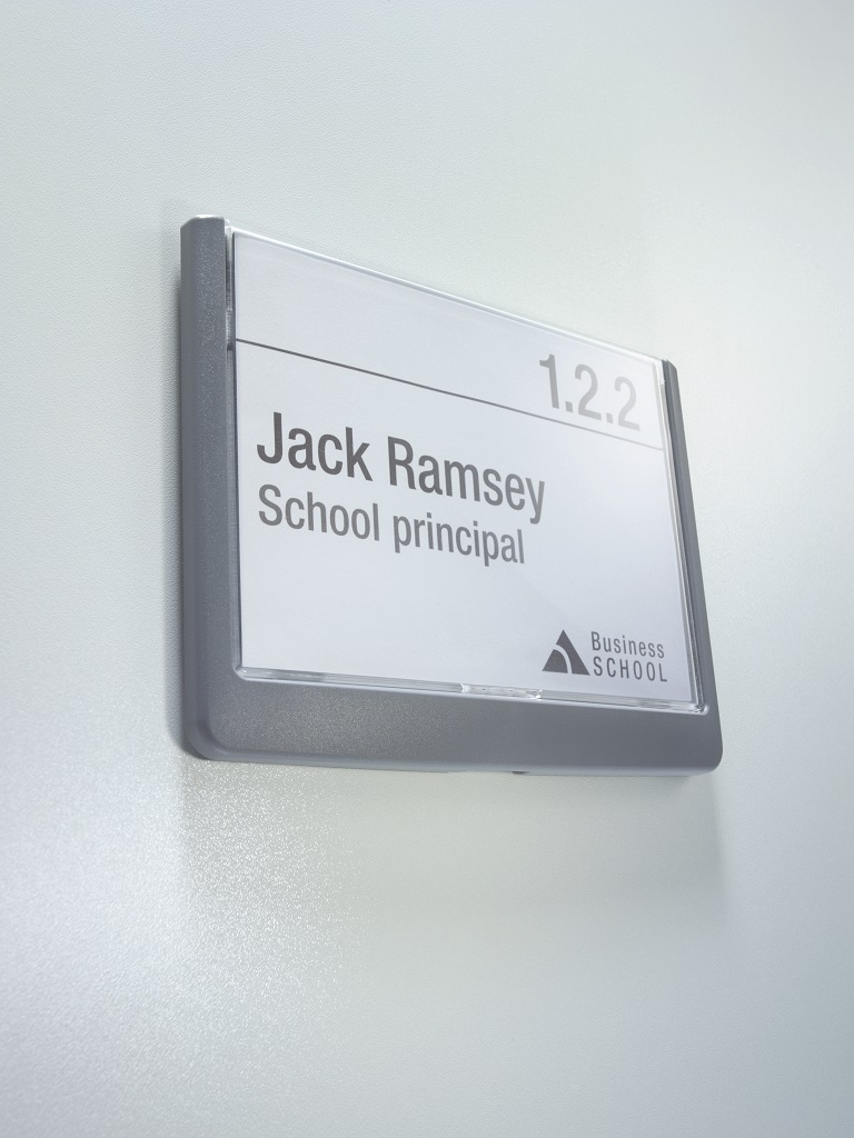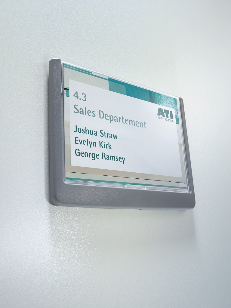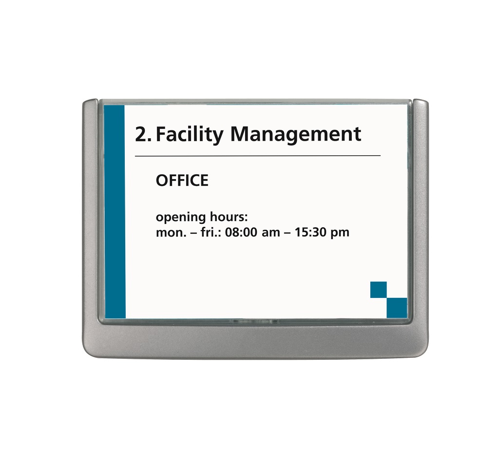 Moderná informačná tabuľka na dvere s lemom v atraktívnej grafitovej farbe. Predný panel sa otvára na jedno zatlačenie, a tým sa jednoducho sprístupnia vložené popisné papiere, ktoré sa môžu vymieňať podľa potrieb. Tabuľka je ideálna do kancelárií, úradov, škôl, univerzít a hotelov. Súčasťou balenia je montážna sada s názorným návodom. Namiesto pevného montovania môže byť tabuľka k povrchu aj prilepená.