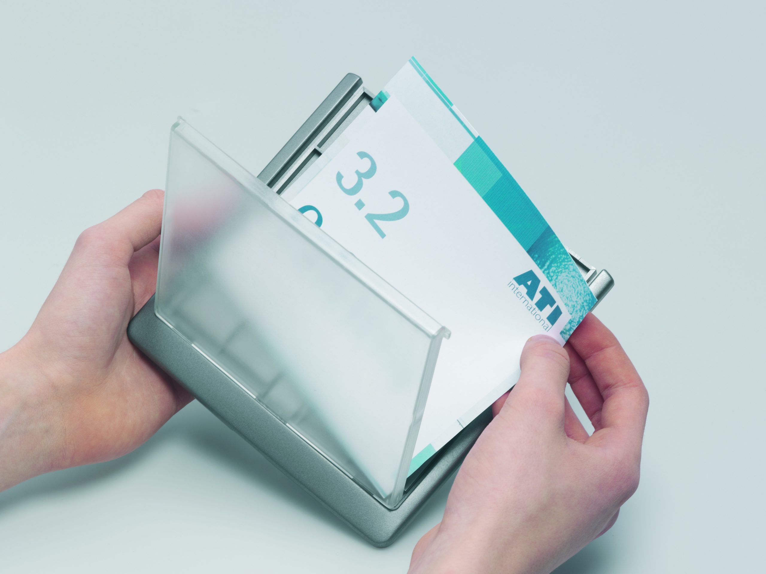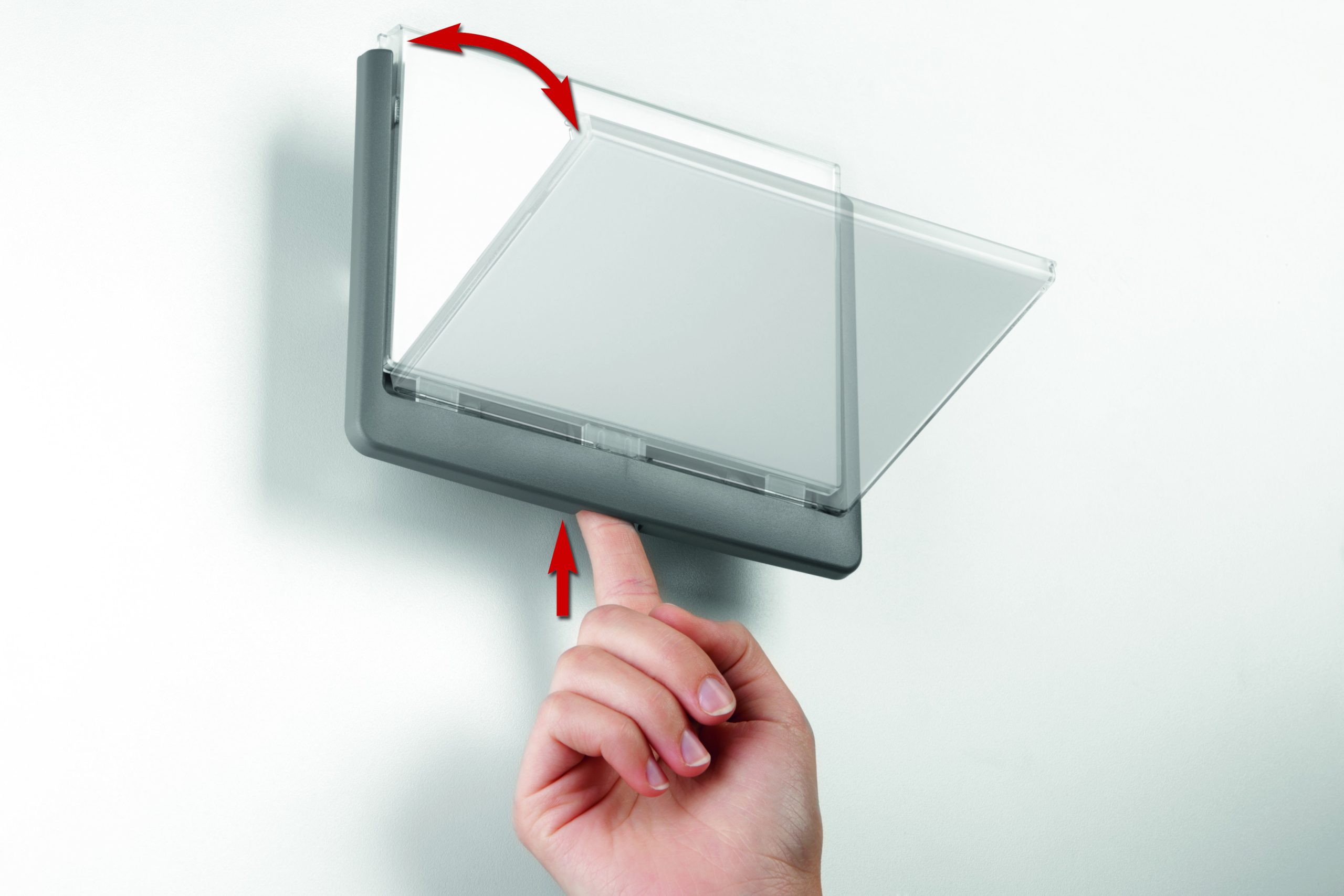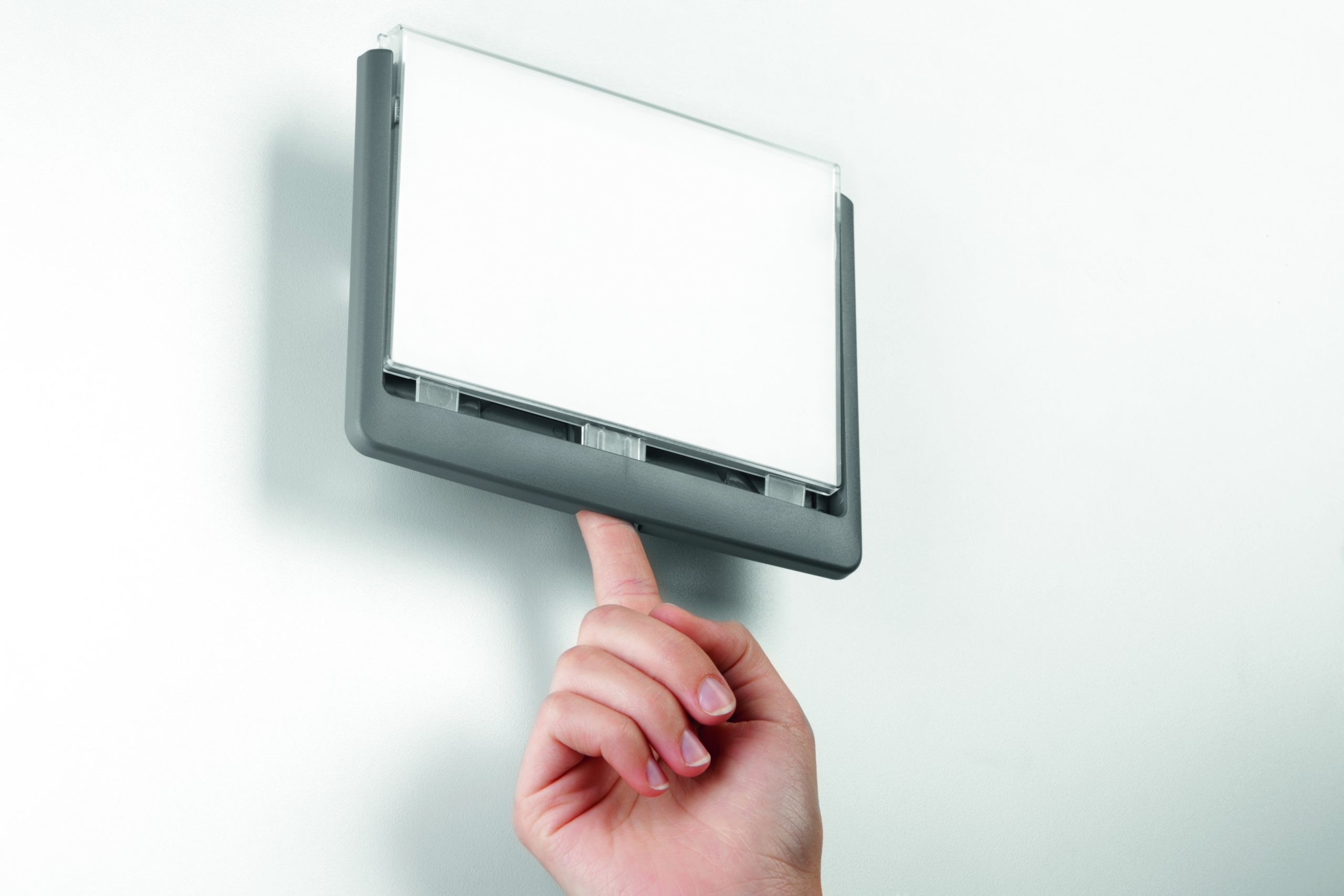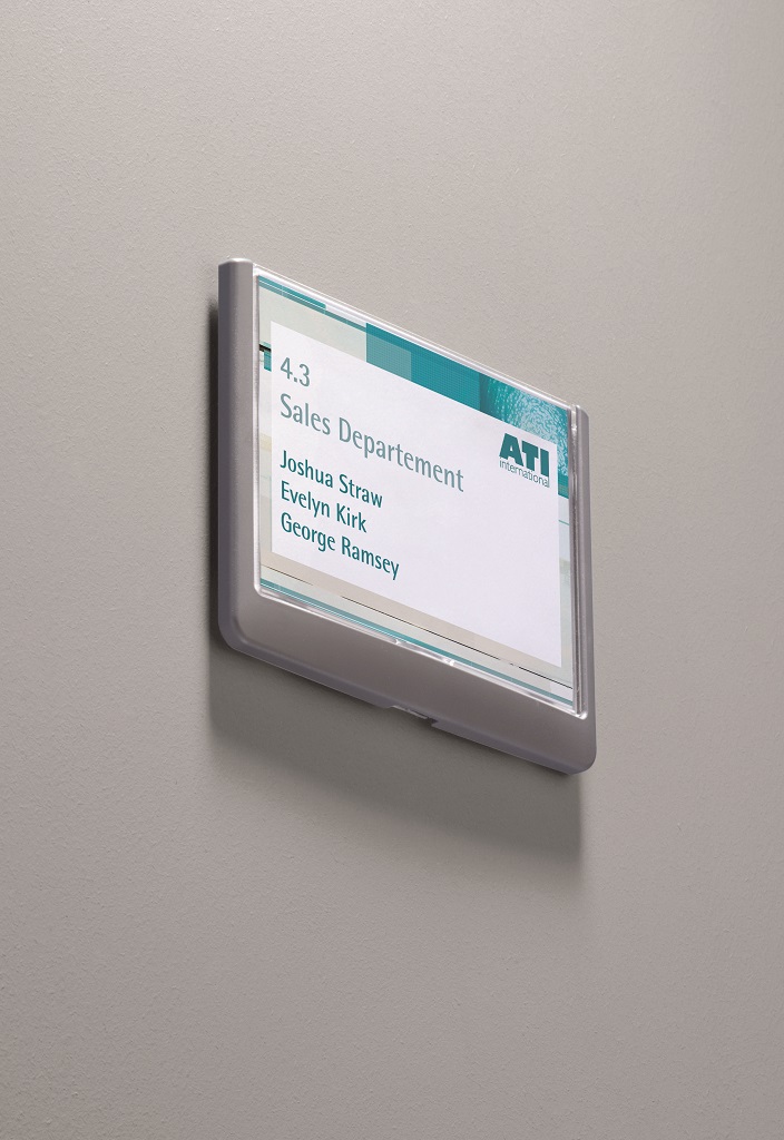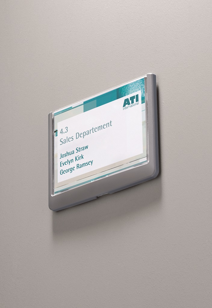 Moderná informačná tabuľka na dvere s lemom v atraktívnej grafitovej farbe. Predný panel sa otvára na jedno zatlačenie, a tým sa jednoducho sprístupnia vložené popisné papiere, ktoré sa môžu vymieňať podľa potrieb. Tabuľka je ideálna do kancelárií, úradov, škôl, univerzít a hotelov. Súčasťou balenia je montážna sada s názorným návodom. Namiesto pevného montovania môže byť tabuľka k povrchu aj prilepená.