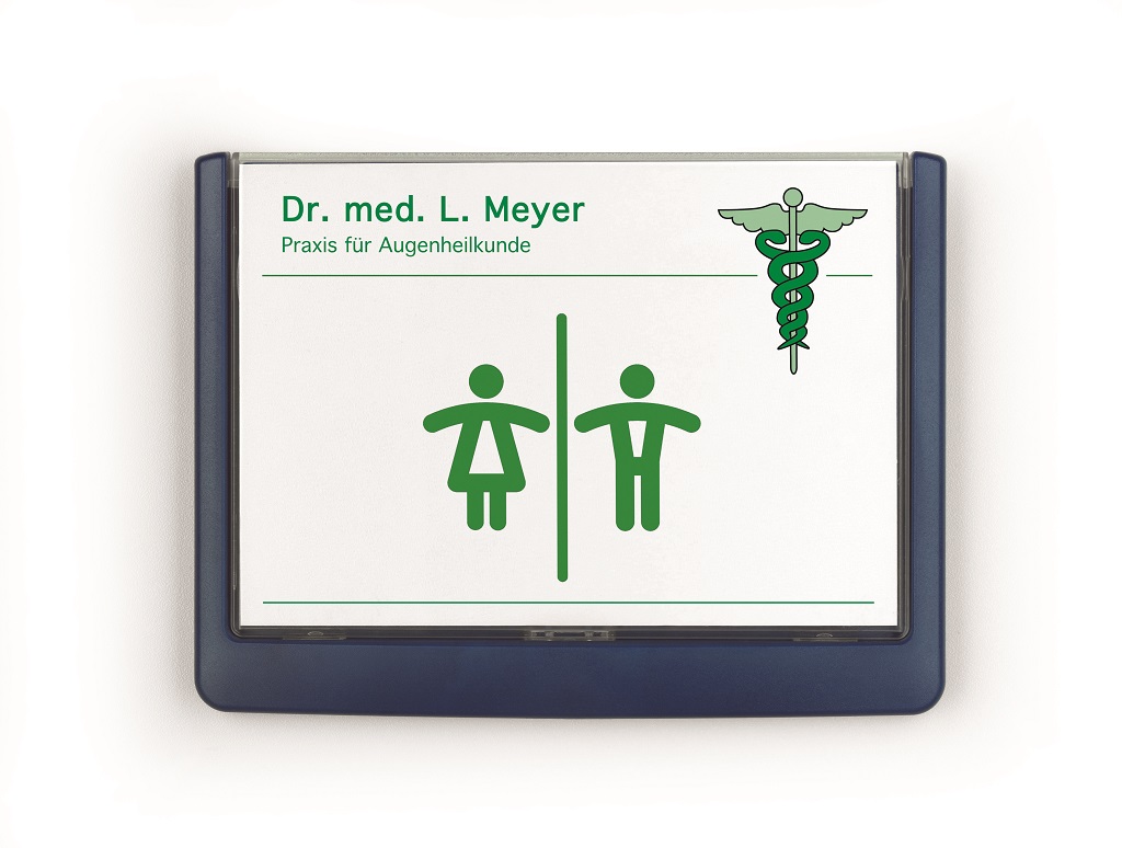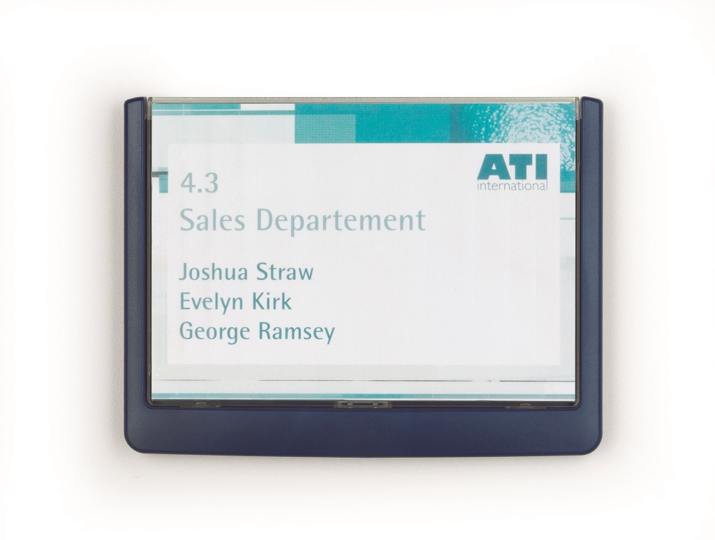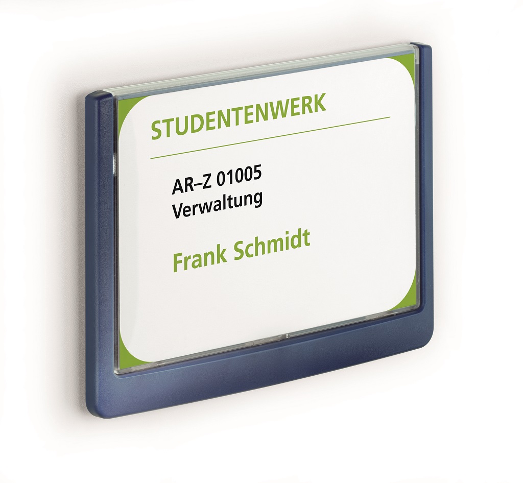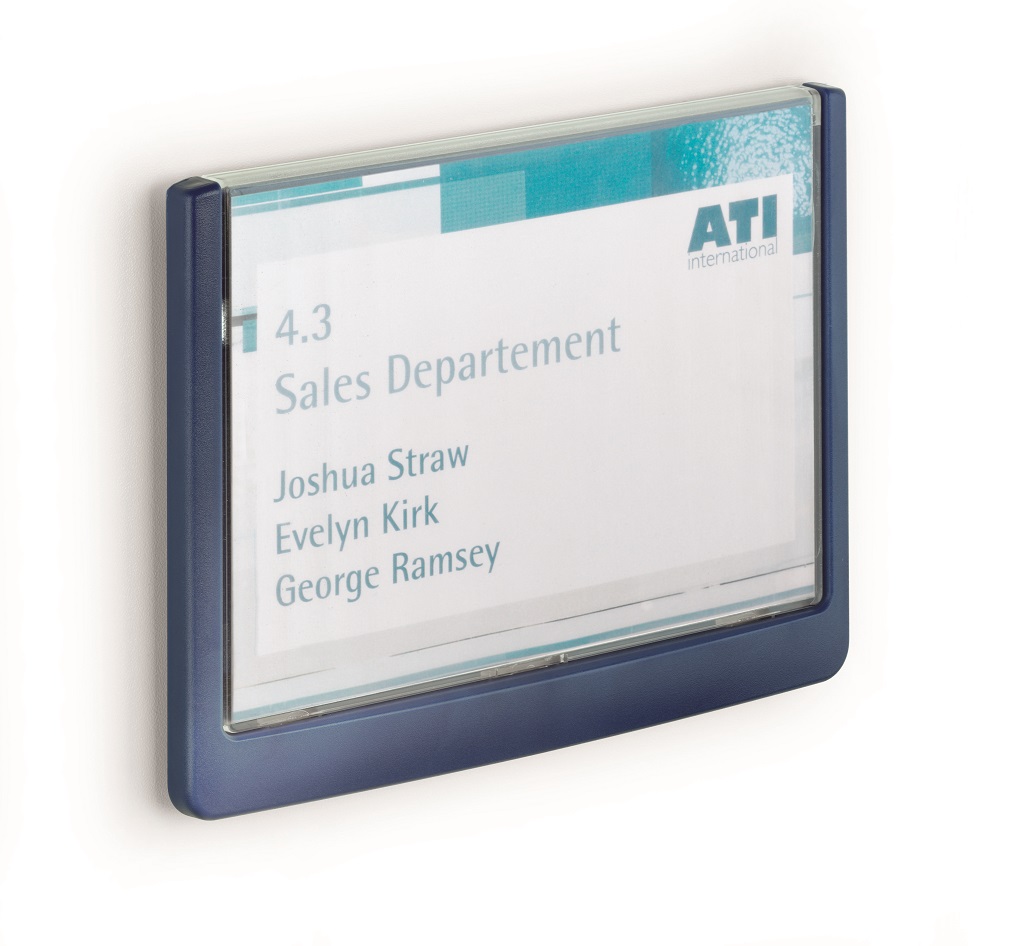 Moderná informačná tabuľka na dvere s lemom v atraktívnej modrej farbe. Predný panel sa otvára na jedno zatlačenie, a tým sa jednoducho sprístupnia vložené popisné papiere, ktoré sa môžu vymieňať podľa potrieb. Tabuľka je ideálna do kancelárií, úradov, škôl, univerzít a hotelov. Súčasťou balenia je montážna sada s názorným návodom. Namiesto pevného montovania môže byť tabuľka k povrchu aj prilepená.