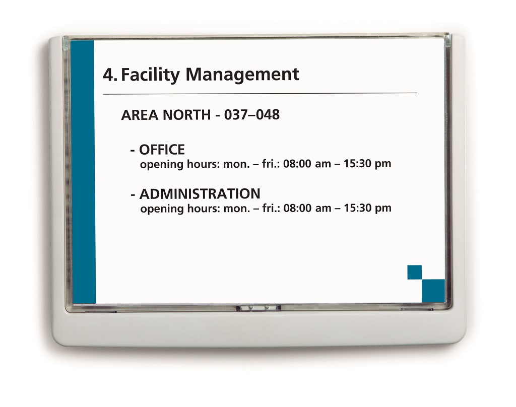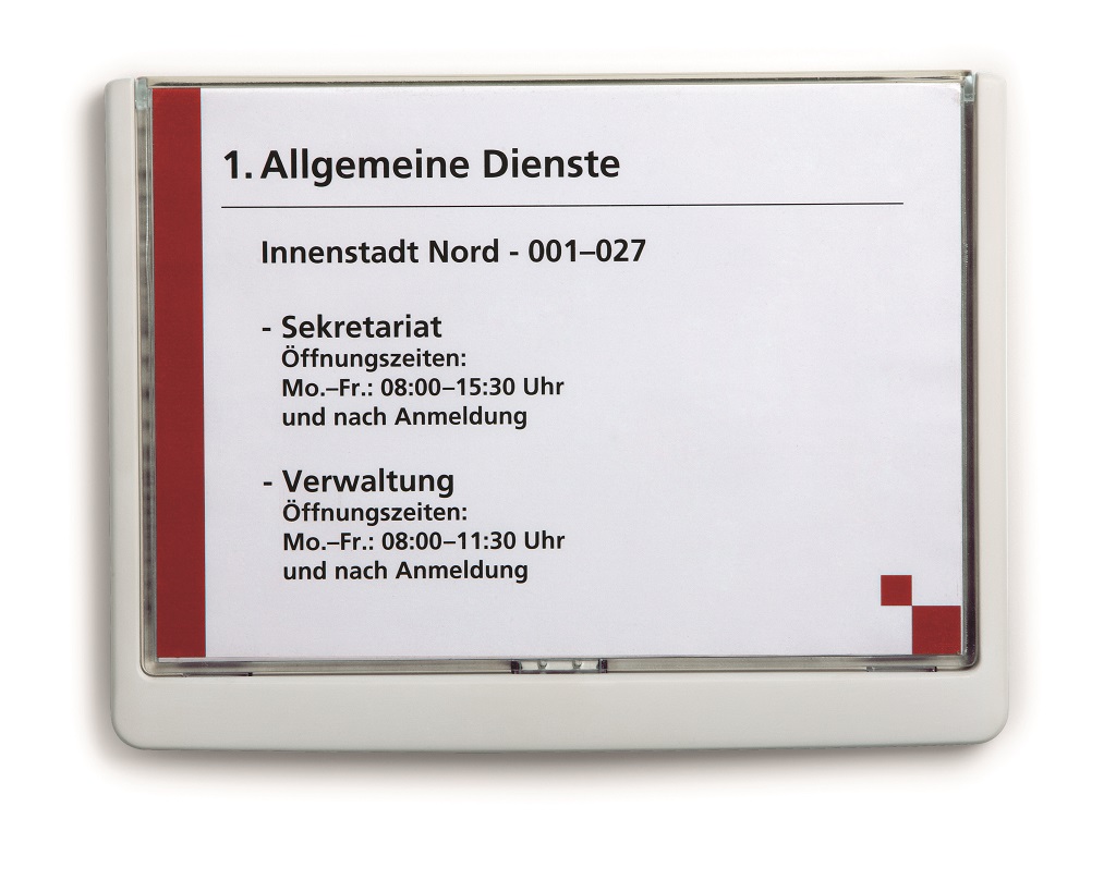 Moderná informačná tabuľka na dvere s lemom v atraktívnej bielej farbe. Predný panel sa otvára na jedno zatlačenie, a tým sa jednoducho sprístupnia vložené popisné papiere, ktoré sa môžu vymieňať podľa potrieb. Tabuľka je ideálna do kancelárií, úradov, škôl, univerzít a hotelov. Súčasťou balenia je montážna sada s názorným návodom. Namiesto pevného montovania môže byť tabuľka k povrchu aj prilepená.