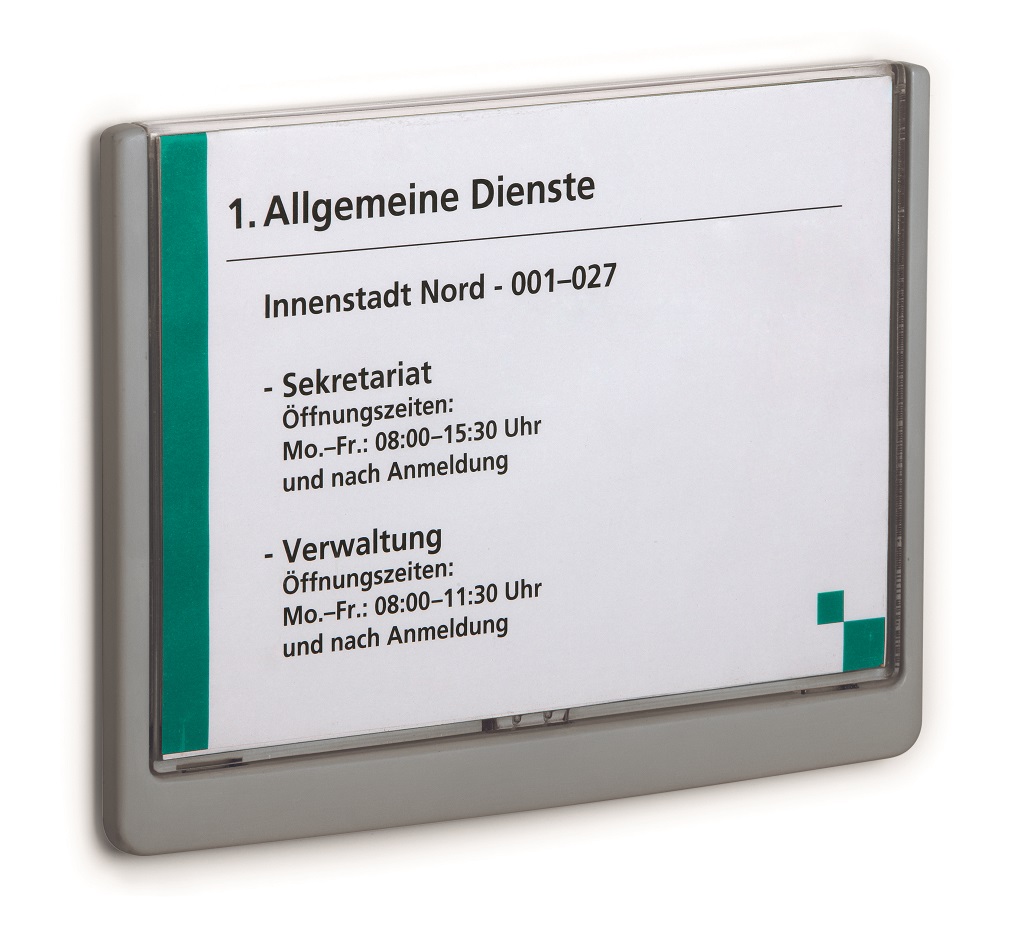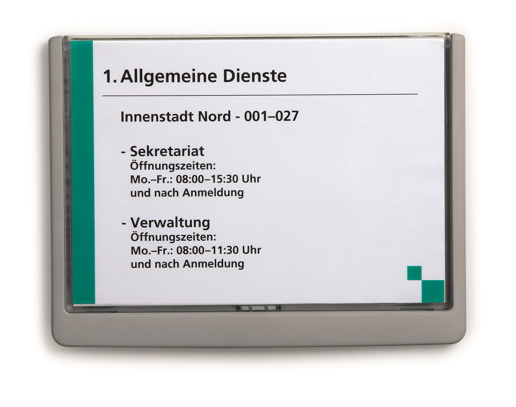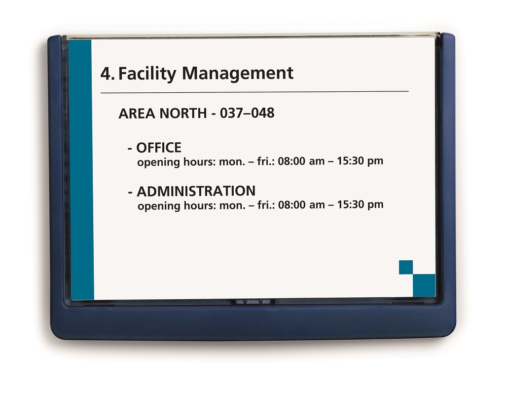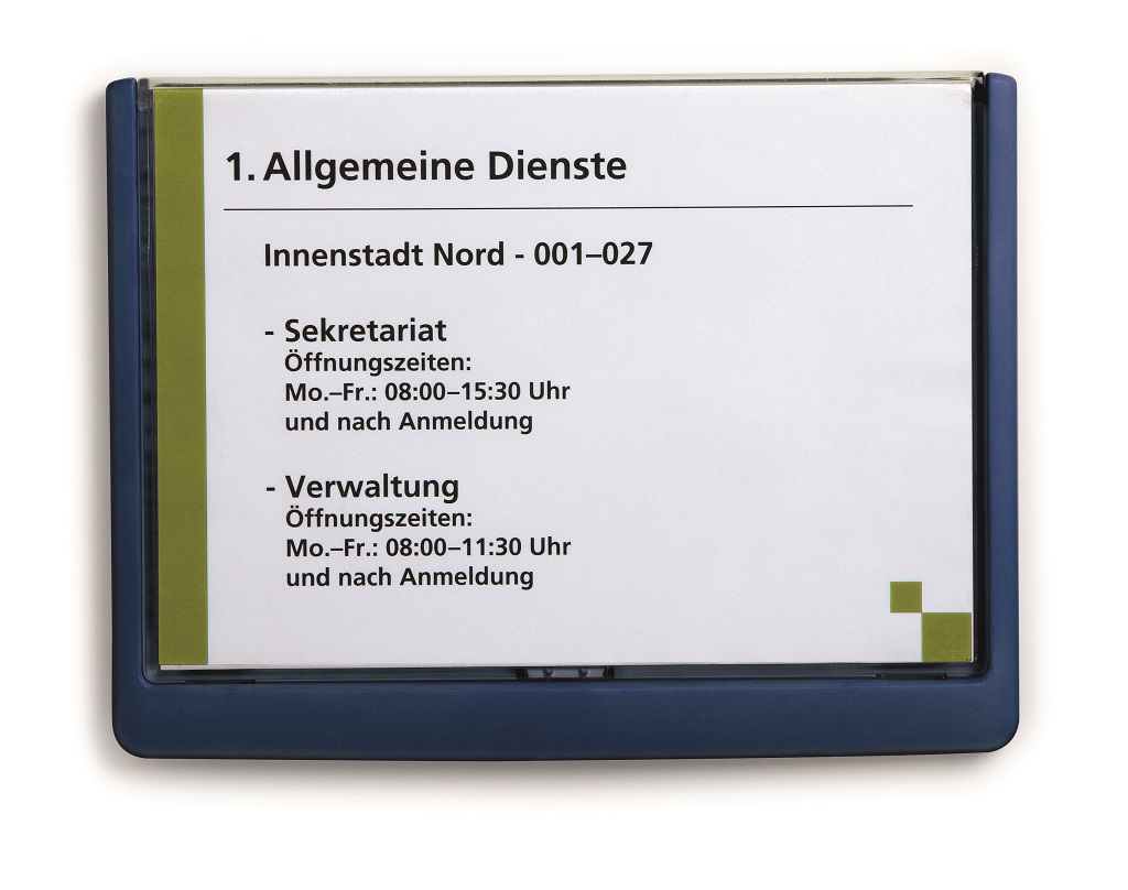 Moderná informačná tabuľka na dvere s lemom v atraktívnej modrej farbe. Predný panel sa otvára na jedno zatlačenie, a tým sa jednoducho sprístupnia vložené popisné papiere, ktoré sa môžu vymieňať podľa potrieb. Tabuľka je ideálna do kancelárií, úradov, škôl, univerzít a hotelov. Súčasťou balenia je montážna sada s názorným návodom. Namiesto pevného montovania môže byť tabuľka k povrchu aj prilepená.