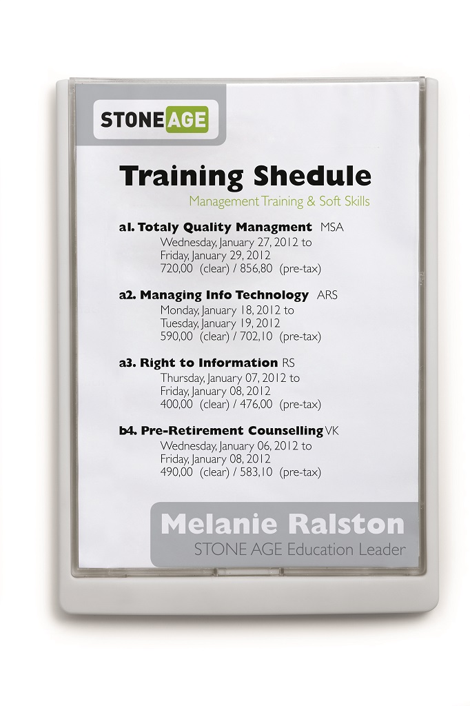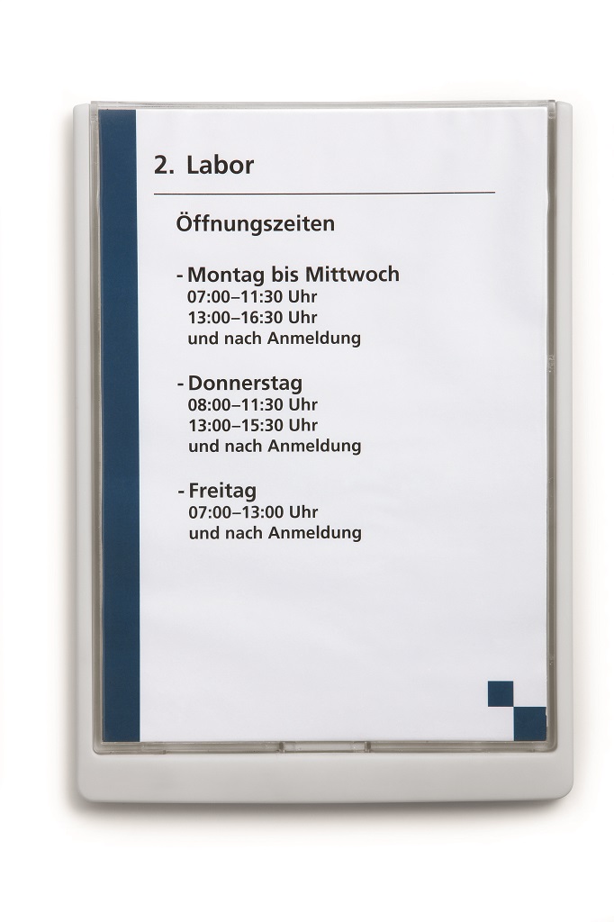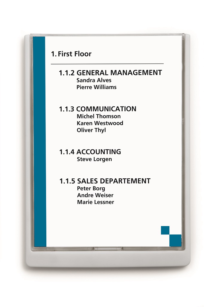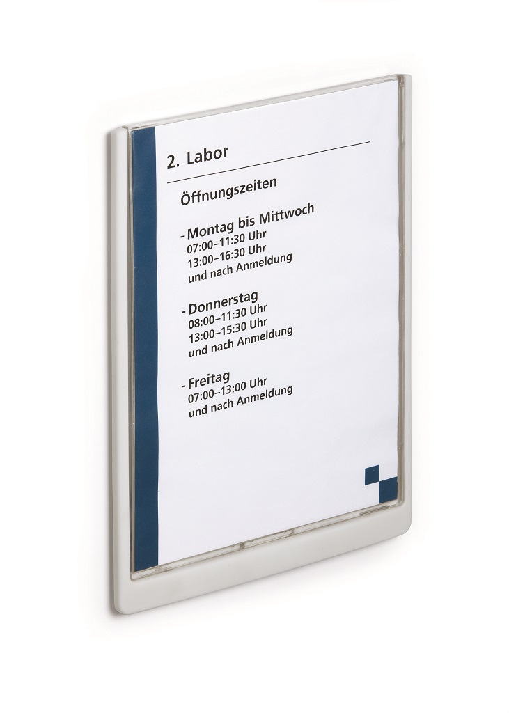 Moderná informačná tabuľka na dvere s lemom v atraktívnej bielej farbe. Predný panel sa otvára na jedno zatlačenie, a tým sa jednoducho sprístupnia vložené popisné papiere, ktoré sa môžu vymieňať podľa potrieb. Tabuľka je ideálna do kancelárií, úradov, škôl, univerzít a hotelov. Súčasťou balenia je montážna sada s názorným návodom. Namiesto pevného montovania môže byť tabuľka k povrchu aj prilepená.