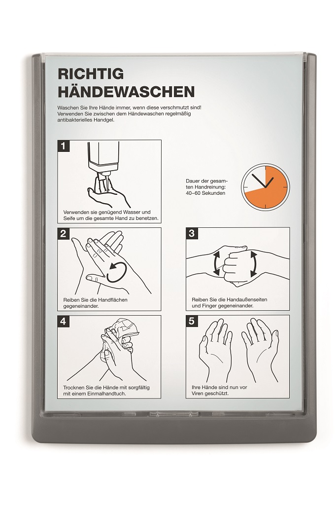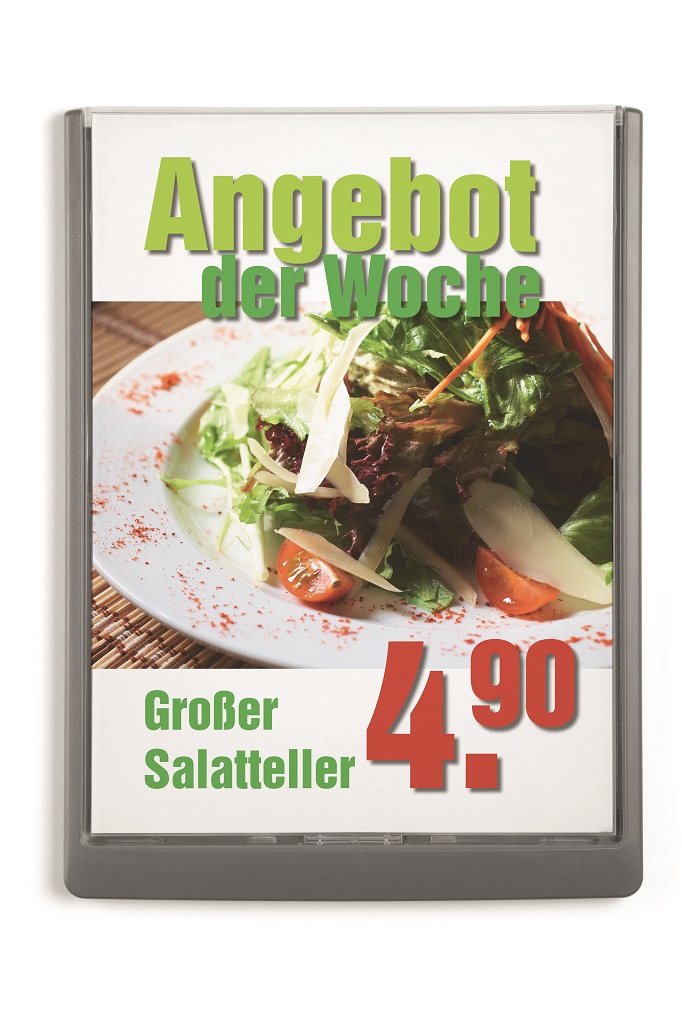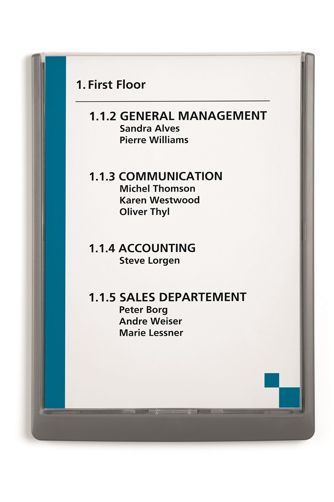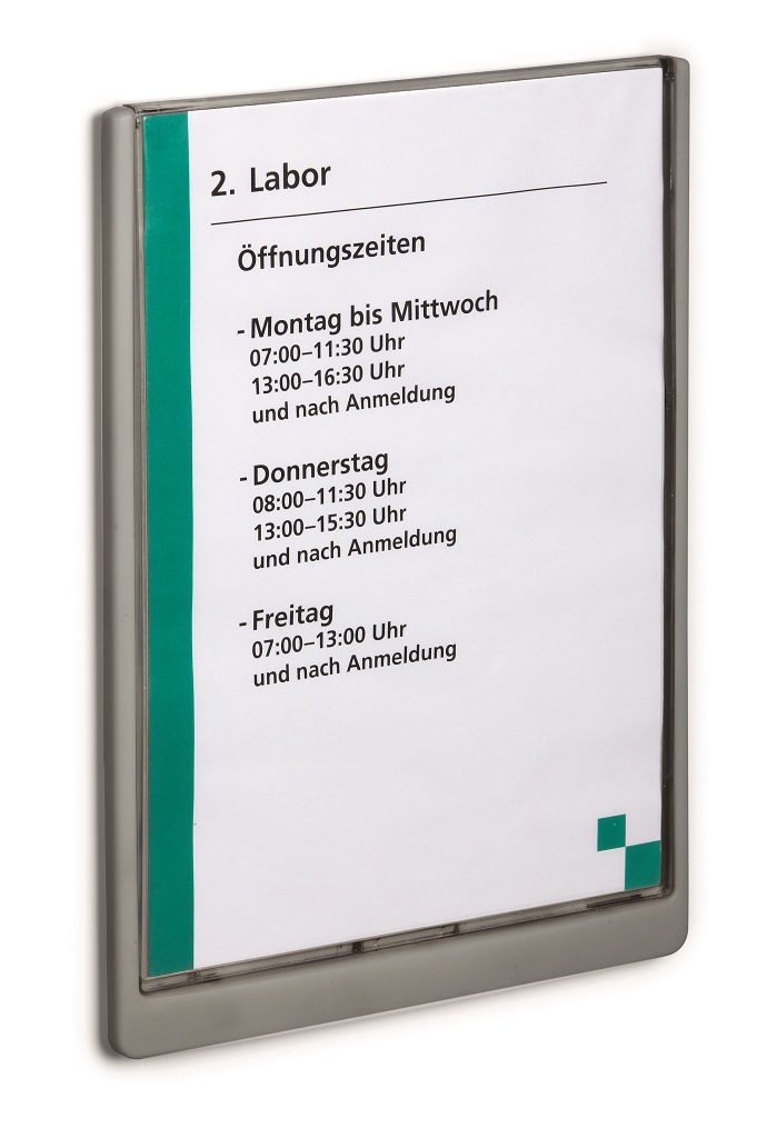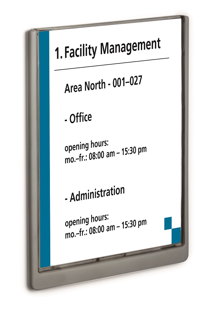 Moderná informačná tabuľka na dvere s lemom v atraktívnej grafitovej farbe. Predný panel sa otvára na jedno zatlačenie, a tým sa jednoducho sprístupnia vložené popisné papiere, ktoré sa môžu vymieňať podľa potrieb. Tabuľka je ideálna do kancelárií, úradov, škôl, univerzít a hotelov. Súčasťou balenia je montážna sada s názorným návodom. Namiesto pevného montovania môže byť tabuľka k povrchu aj prilepená.