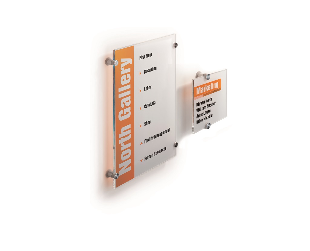 Tabuľka na dvere z novej rady v elegantnom, atraktívnom, a zároveň jednoduchom dizajne. Dodávaná s 2 polopriehľadnými vnútornými listami, vhodnými na farebnú alebo čiernu potlač. Listy sa vložia medzi akrylové panely tabuľky a tabuľka sa prichytí k stene alebo dverám 2 veľkými hliníkovými skrutkami. Ľahká montáž, názorný návod je priložený.