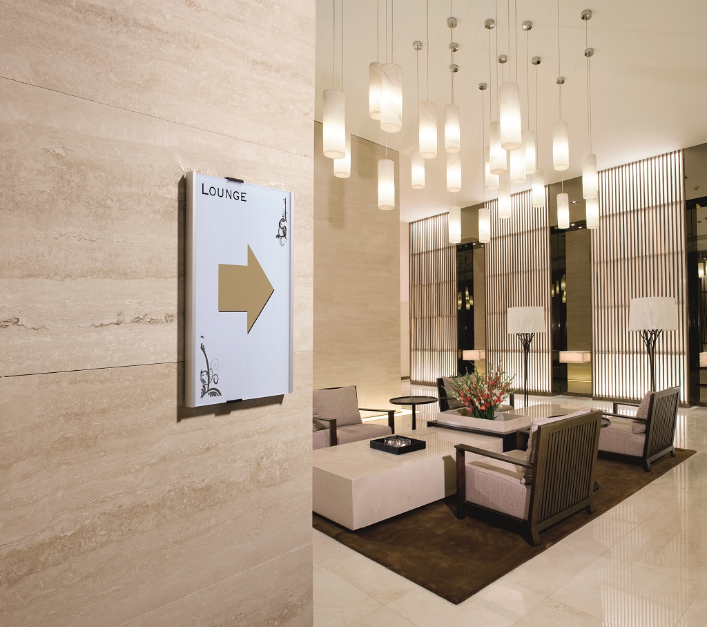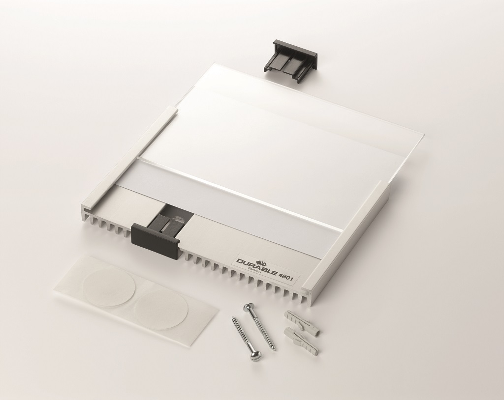 Informačná tabuľka na dvere. Štylizovaná tabuľka vo vrúbkovanej úprave, spodná časť z vysoko kvalitného hliníka, fixujúce spojky v čiernej farbe. K podkladu môže byť zadnou časťou priskrutkovaná alebo nalepená. Text je chránený neoslňujúcim akrylátovým krytom, ktorý pridržiavajú dve fixujúce spojky. Súčasťou balenia je montážna sada s názorným návodom a čistým listom papiera vo veľkosti tabuľky.