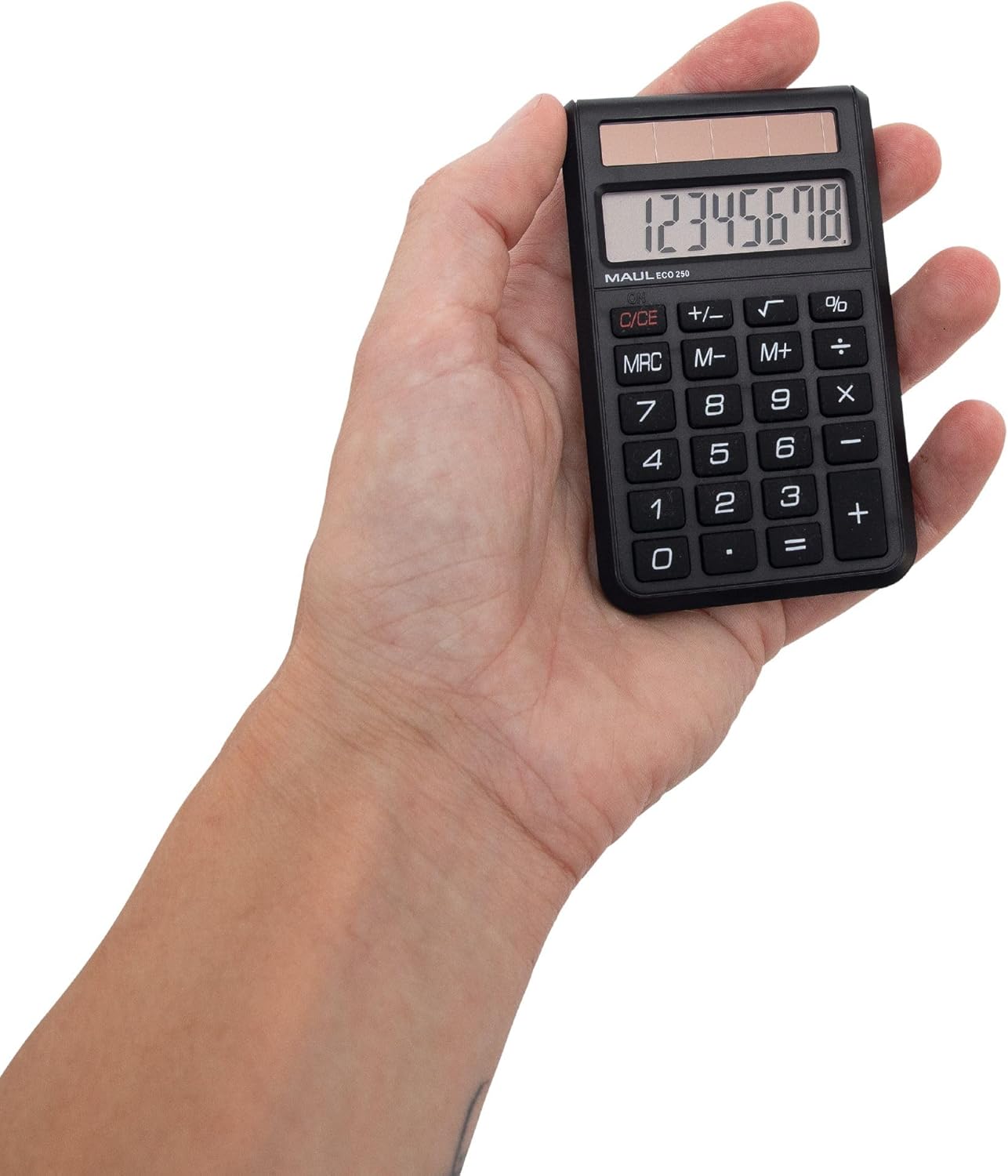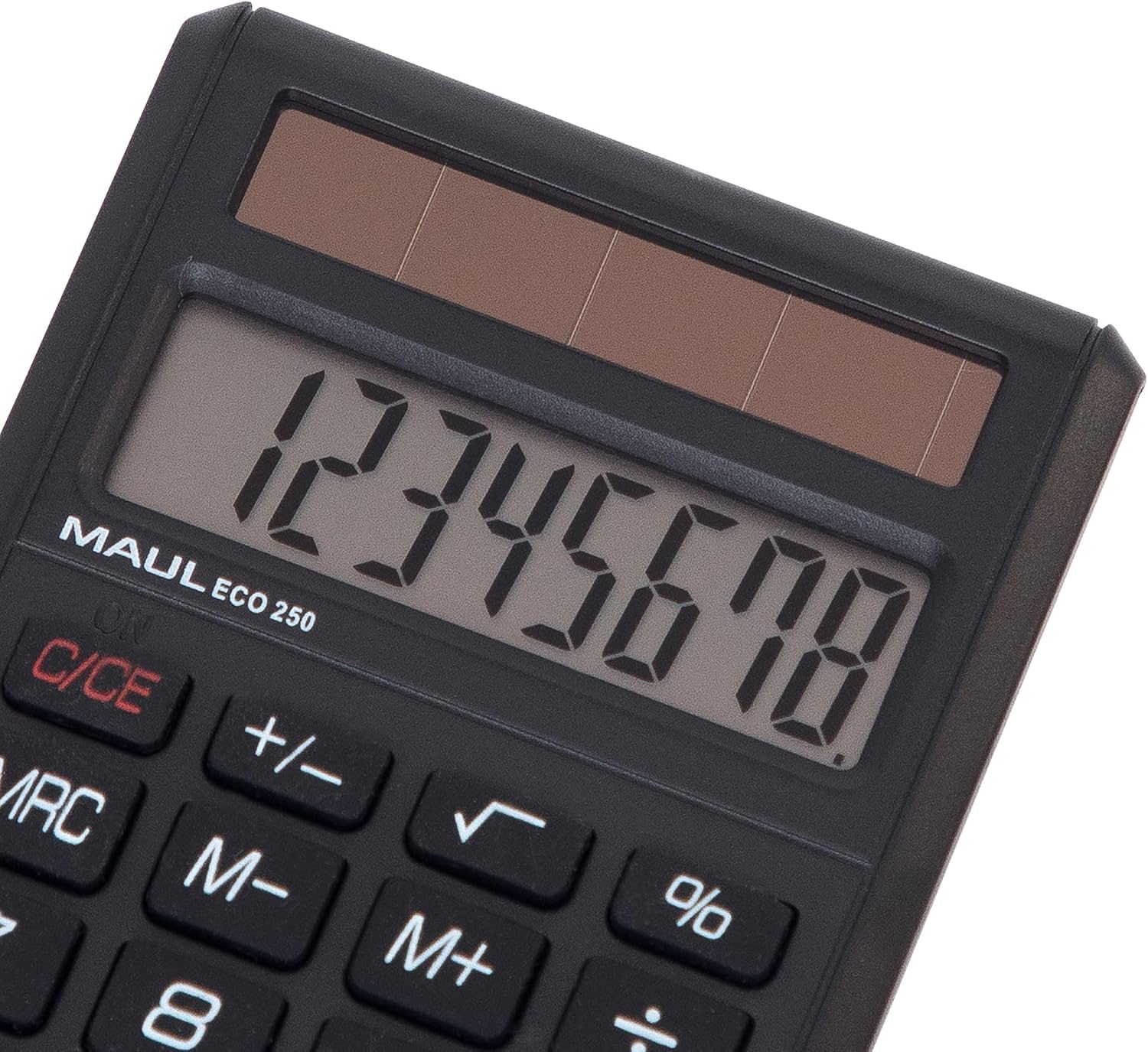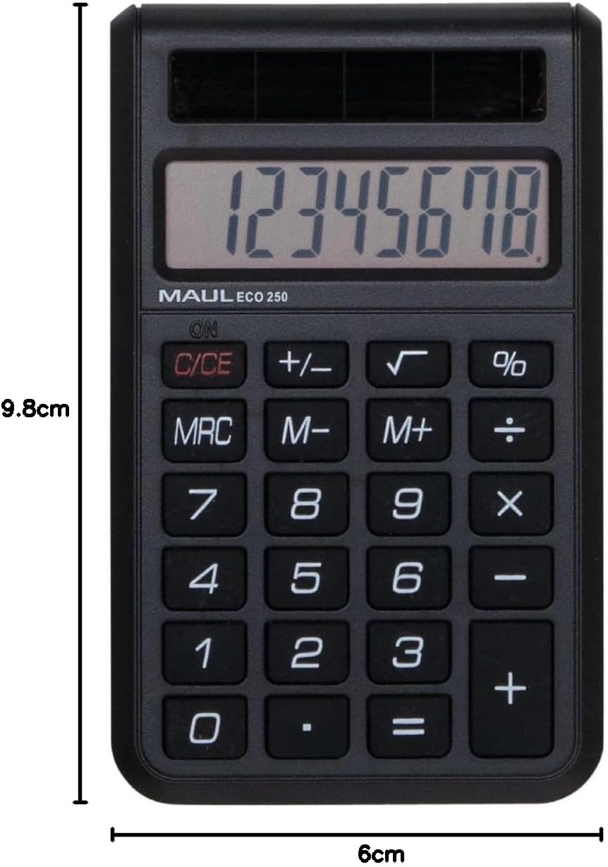 Vrecková kalkulačka s 8‑miestnym LCD displejom, plastovými tlačidlami a štandardnými funkciami.