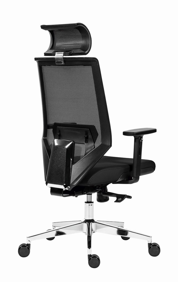 Kancelárska stolička so sieťovaným operadlom a uhlovo nastaviteľným podhlavníkom.
