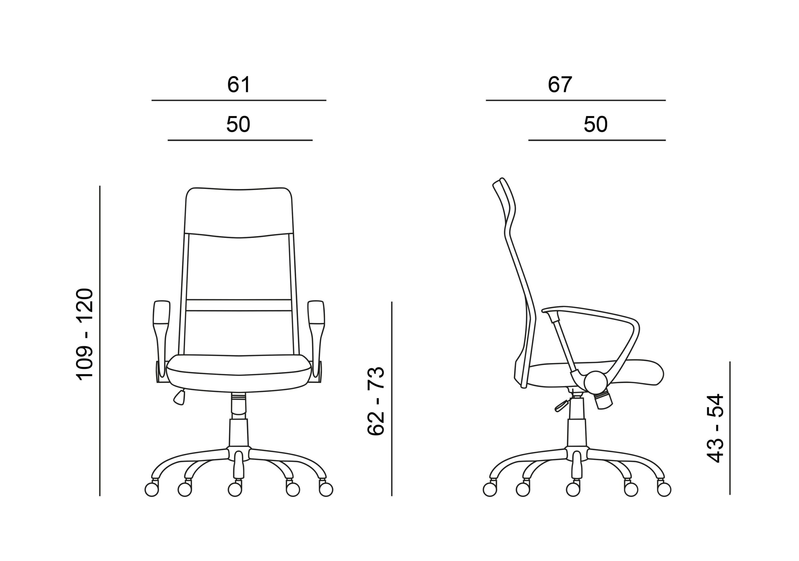 • celková výška 109-120 cm, šírka 61 cm, hĺbka sedáku 50 cm, výška sedáku 43-54 cm