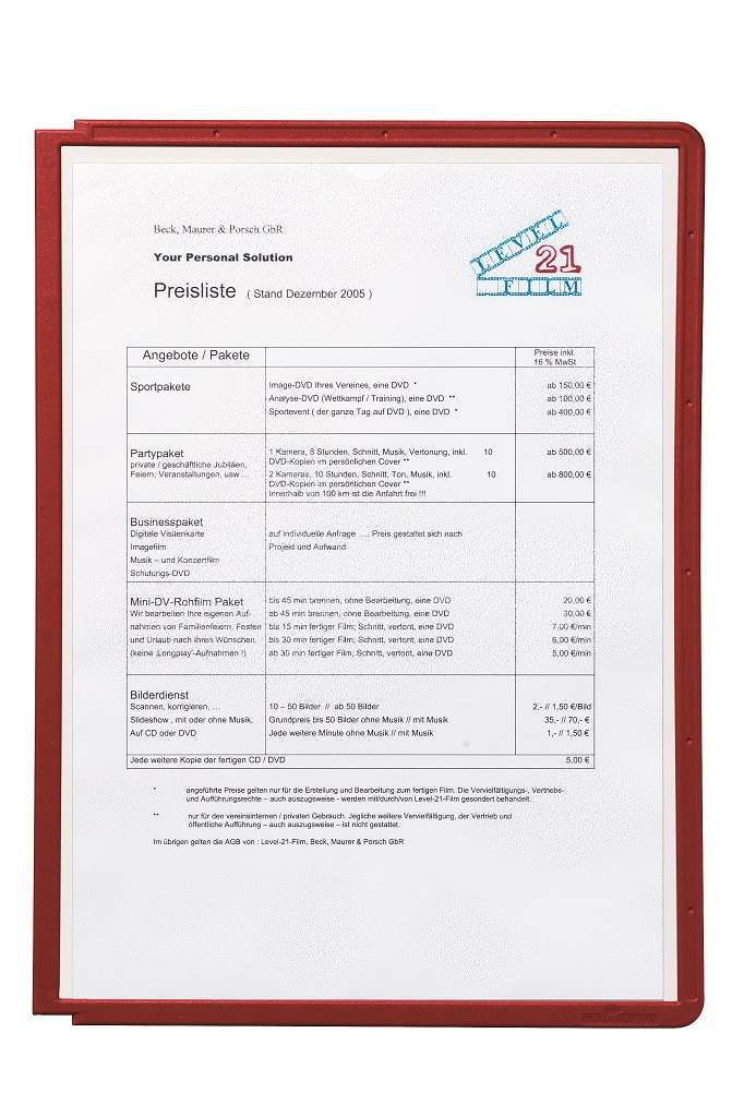 Displejový panel vyrobený z matného antireflexného polypropylénu pre systém Sherpa, kovové držiaky a rotačný stojan. Vložený materiál je kopírovateľný a skenovateľný. Pevný farebný rám s pozíciami pre indexy. Formát A4. Balenie 5 ks.