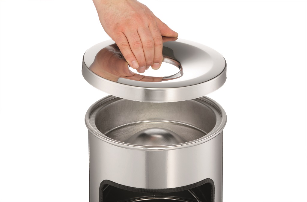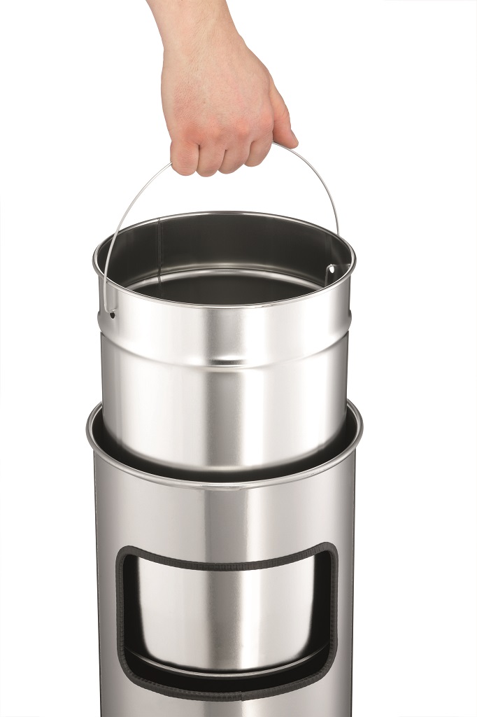 Kovový kôš na odpadky a popolník v jednom. Vhodný na použitie do interiéru aj exteriéru. Bezpečnostné samohasiace hliníkové veko. Objem koša 17 l, výška 630 mm, priemer 250 mm. Objem popolníka 2 l, výška 60 mm, priemer 240 mm.