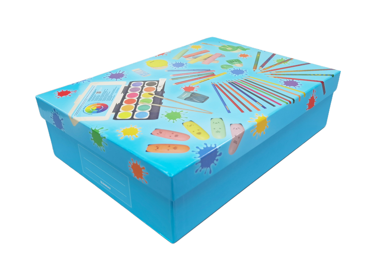 Perfektne navrhnutý box na uskladnenie a organizáciu výtvarných a školských potrieb. Bez problémov sa doň zmestí výkresový blok formátu A4, zošit či zápisník. Vyrobený z pevného kartónu, potiahnutý papierom s lesklým povrchom a praktickou plochou na popis, pevné veko. Rozmery: veko: 33,5 × 24 × 3 cm, box: 33 × 23,5 × 9 cm.