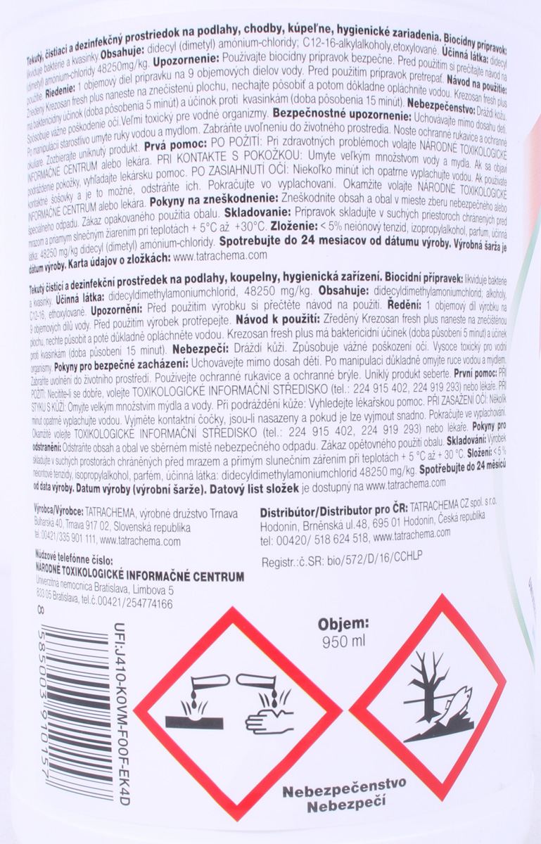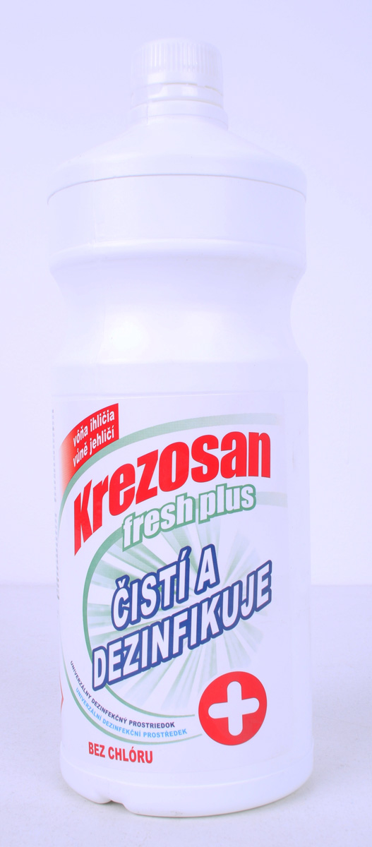 Vlastnosti: KREZOSAN fresh je tekutý čistiaci prostriedok s dezinfekčným účinkom. Slúži na čistenie a dezinfekciu verejných hygienických a zdravotníckych priestorov, na dezinfekciu a čistenie všetkých druhov podláh, chodieb, kúpeľní, sociálnych zariadení, a pod. Krezosan fresh plus má baktericídny účinok (doba pôsobenia 5 minút) a účinok proti kvasinkám (doba pôsobenia 15 minút).