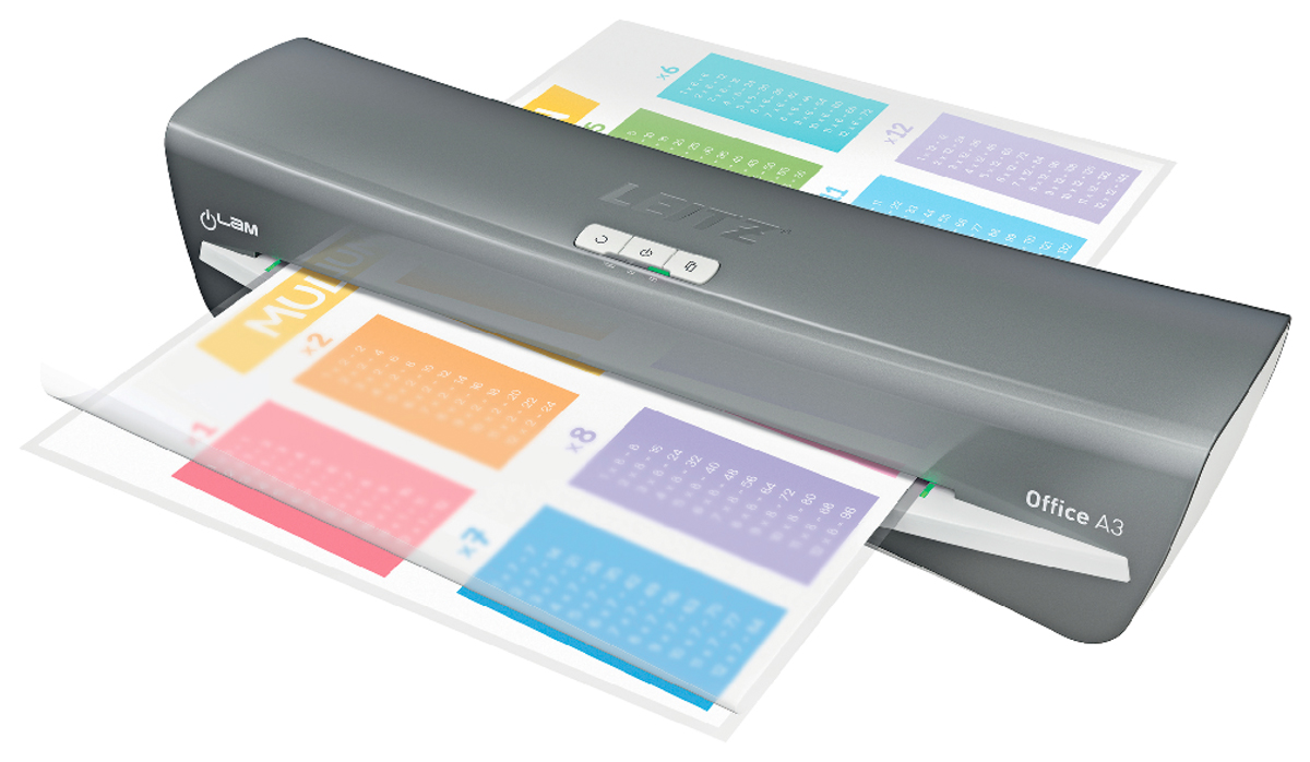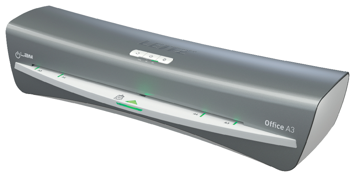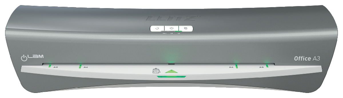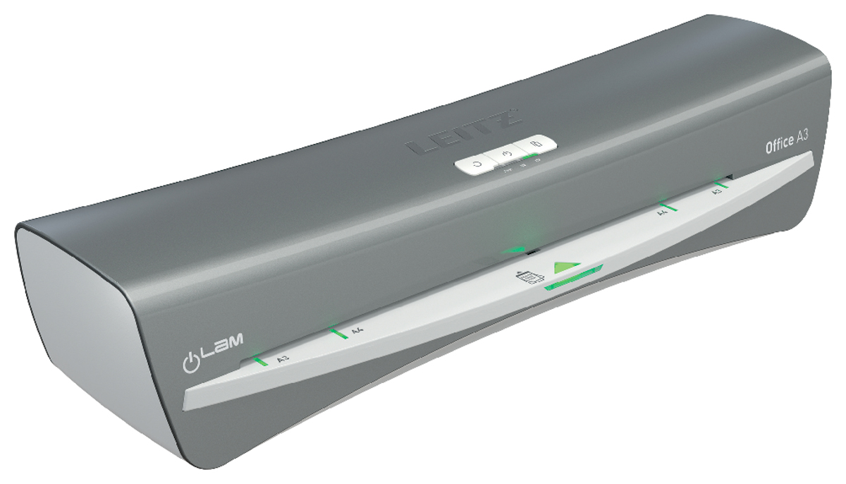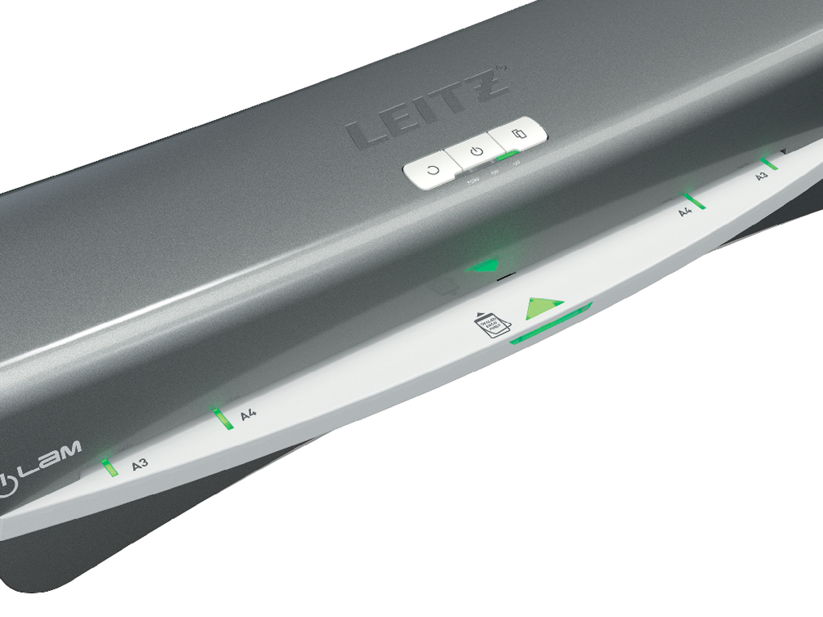 Moderný a kompaktný laminovací prístroj Leitz iLAM Office spája štýl a efektivitu. Tento laminátor vo formáte A3 garantuje ľahké laminovanie, vyznačuje sa rýchlym intervalom zahrievania len za 1 minútu, dokument A4 v 80-mikrónovej kapse na laminovanie zalaminuje už za obyčajných 36 sekúnd. Pomocou intuitívneho dotykového panelu si môžete vybrať jedno z troch nastavení hrúbky vrecka, prípadne využiť tlačidlo spätného chodu pre ľahké vybratie zaseknutej laminovacej kapsy. Inovatívna stavová SMART LED dióda využíva svetelné a zvukové signály: červená dióda znamená zahrievanie, zelená so zvukovým upozornením oznamuje pripravenosť na laminovanie, blikajúca červená dióda znamená automatické vypnutie po 15 minútach nečinnosti. Navyše šikovné vstupné navádzacie LED diódy zabezpečujú dokonalé vyrovnanie vrecka tak, aby sa zabránilo jeho zaseknutiu. Určené na kapsy od 75 do 125 mikrónov. TUV/GS, CE certifikácia. Šedá a biela farba.